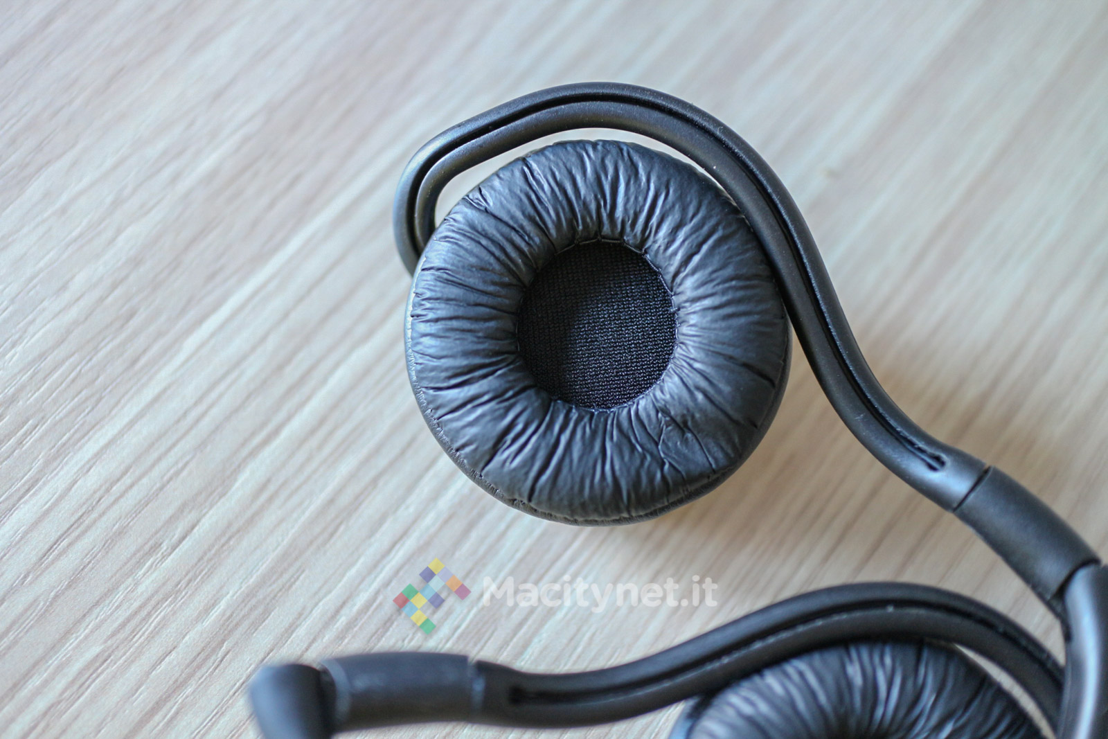 I padiglioni sono di tipo sovraurale, si appoggiano quindi sopra l’orecchio anziché coprirlo totalmente: il diametro è di 5 centimetri ed hanno uno strato in gommapiuma alto circa 7 millimetri foderato di soffice pelle che si adatta alla conformazione dell’orecchio. In pratica coprono per bene l’orecchio ma non lo insonorizzano: quando spente infatti si riescono a percepire i rumori esterni, una scelta intelligente specialmente per chi decide di usarle durante una sessione di jogging all’aria aperta, magari sul ciglio della strada, in quanto basta un click per mettere in pausa la musica o terminare una chiamata e focalizzare tutta l’attenzione su ciò che accade intorno.