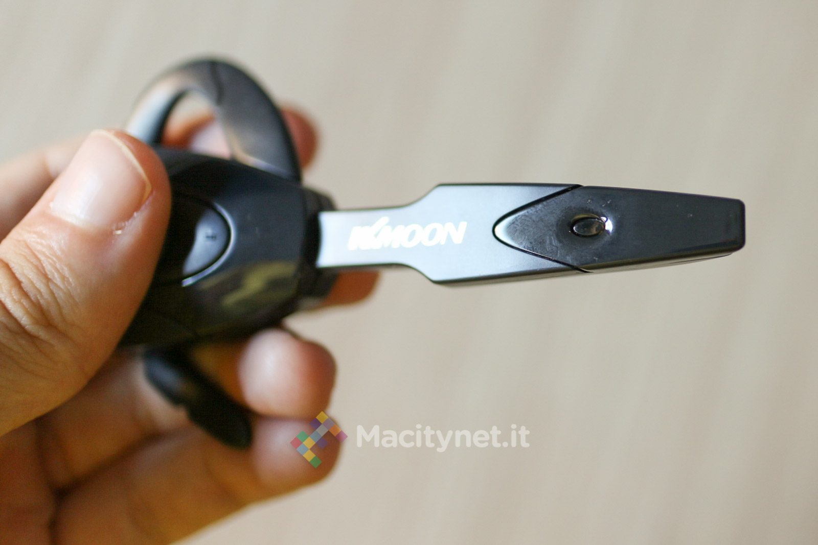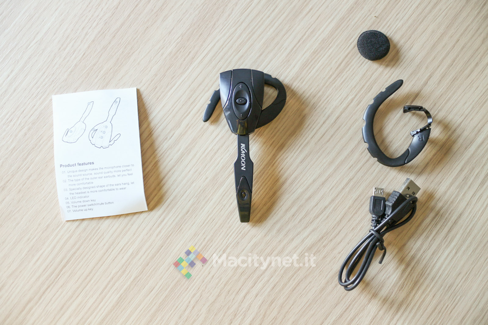 Si chiama KKmoon EX-01 ed è un auricolare che ha attirato la nostra attenzione per il prezzo davvero basso parallelamente alle caratteristiche del prodotto. Fuori dalla scatola, viene accompagnato da un piccolo manuale d’uso, un cavetto microUSB per la ricarica e due pezzi di ricambio (archetto e copertura in gomma piuma dell’auricolare). Tutta la struttura è abbastanza leggera, 13 grammi sulla nostra bilancia da cucina, senz’altro pochi se consideriamo le dimensioni del prodotto (circa 10 x 3 x 1 centimetri).