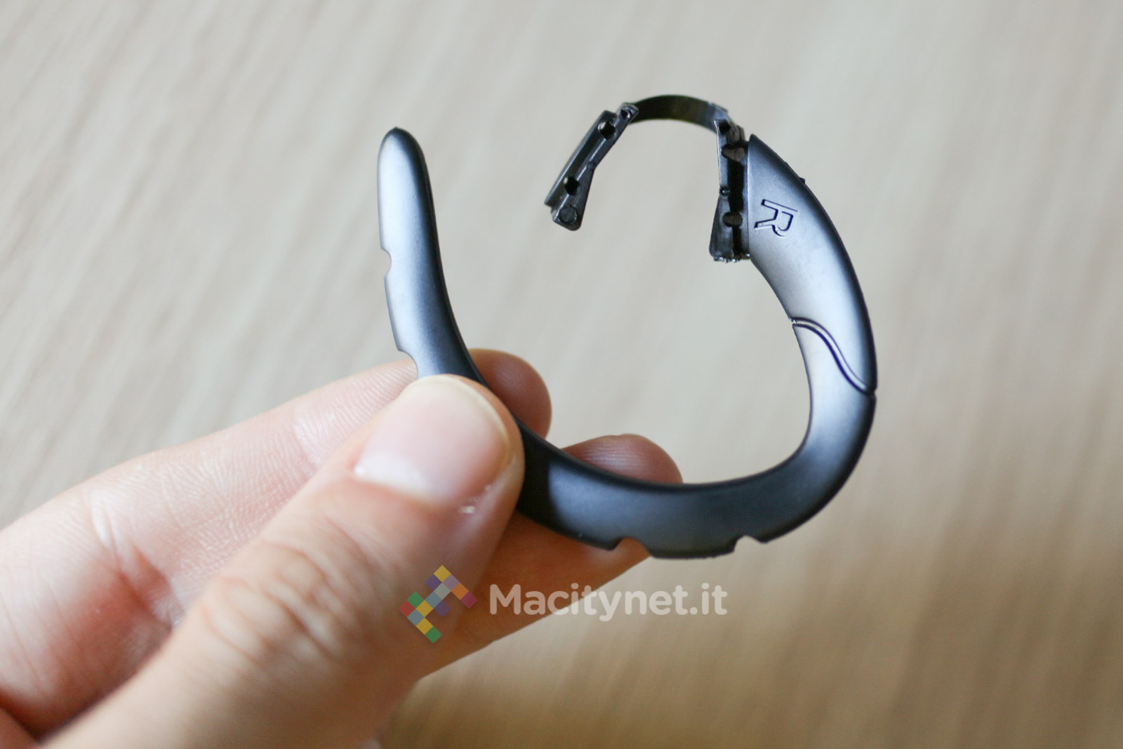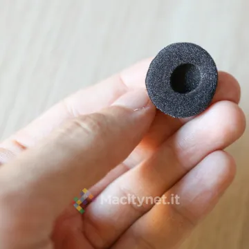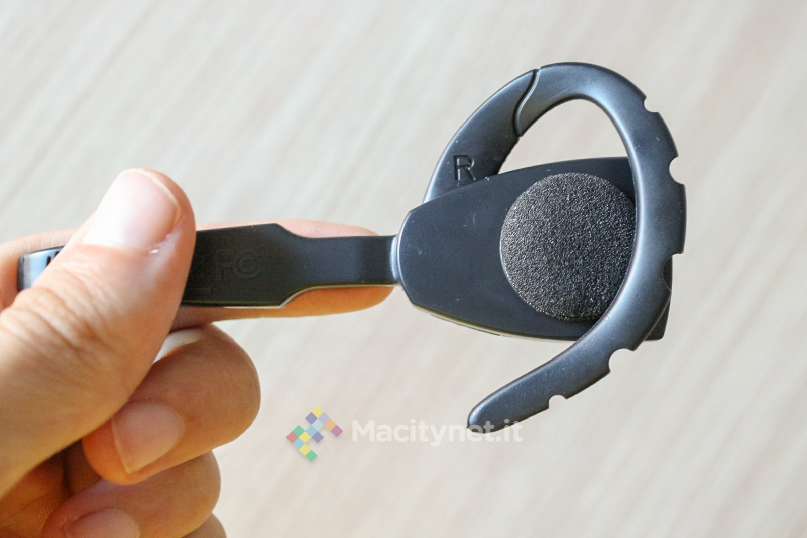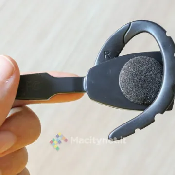 Resteranno infine deluse quelle persone che preferiscono usarlo con l’orecchio sinistro: l’auricolare è predisposto per essere appeso soltanto all’orecchio destro, come lo dimostra la lettera R (right) stampata sia su quello già agganciato all’auricolare, sia su quello di ricambio.
