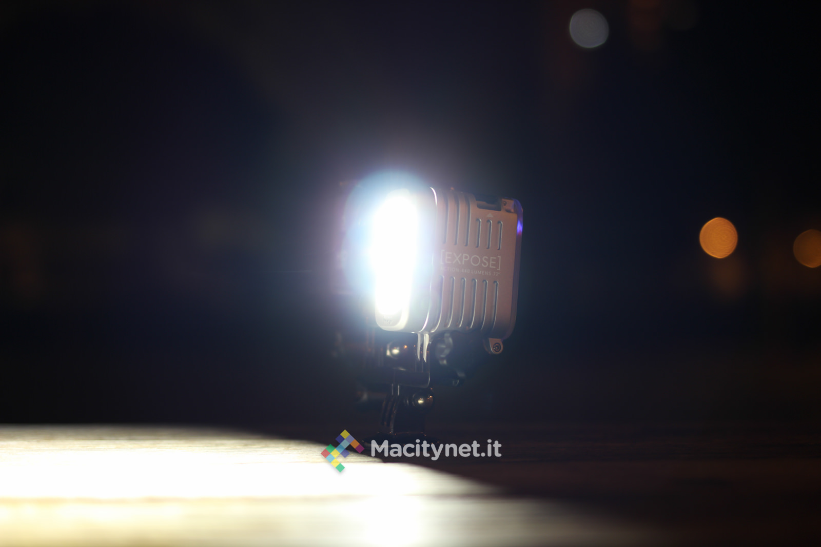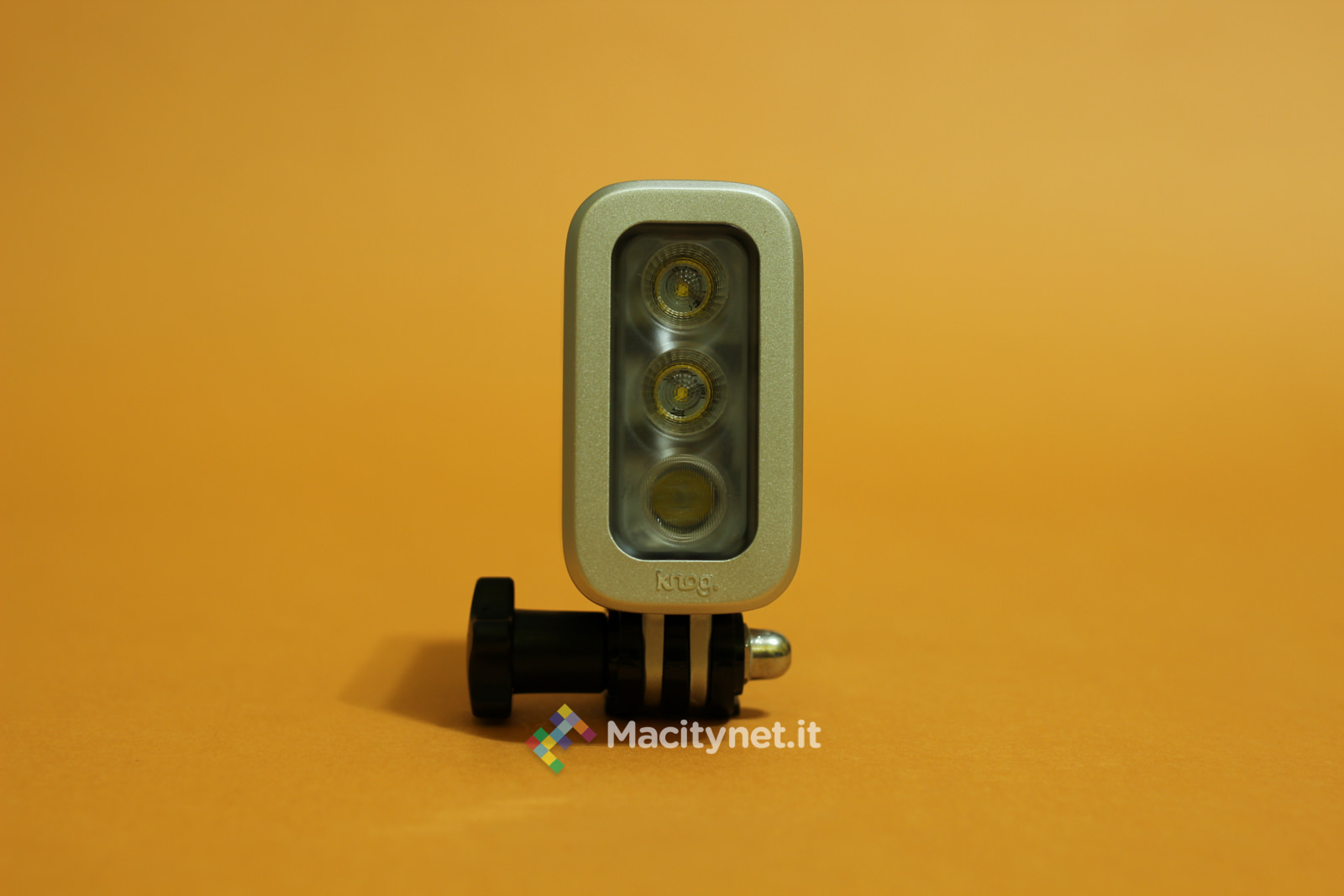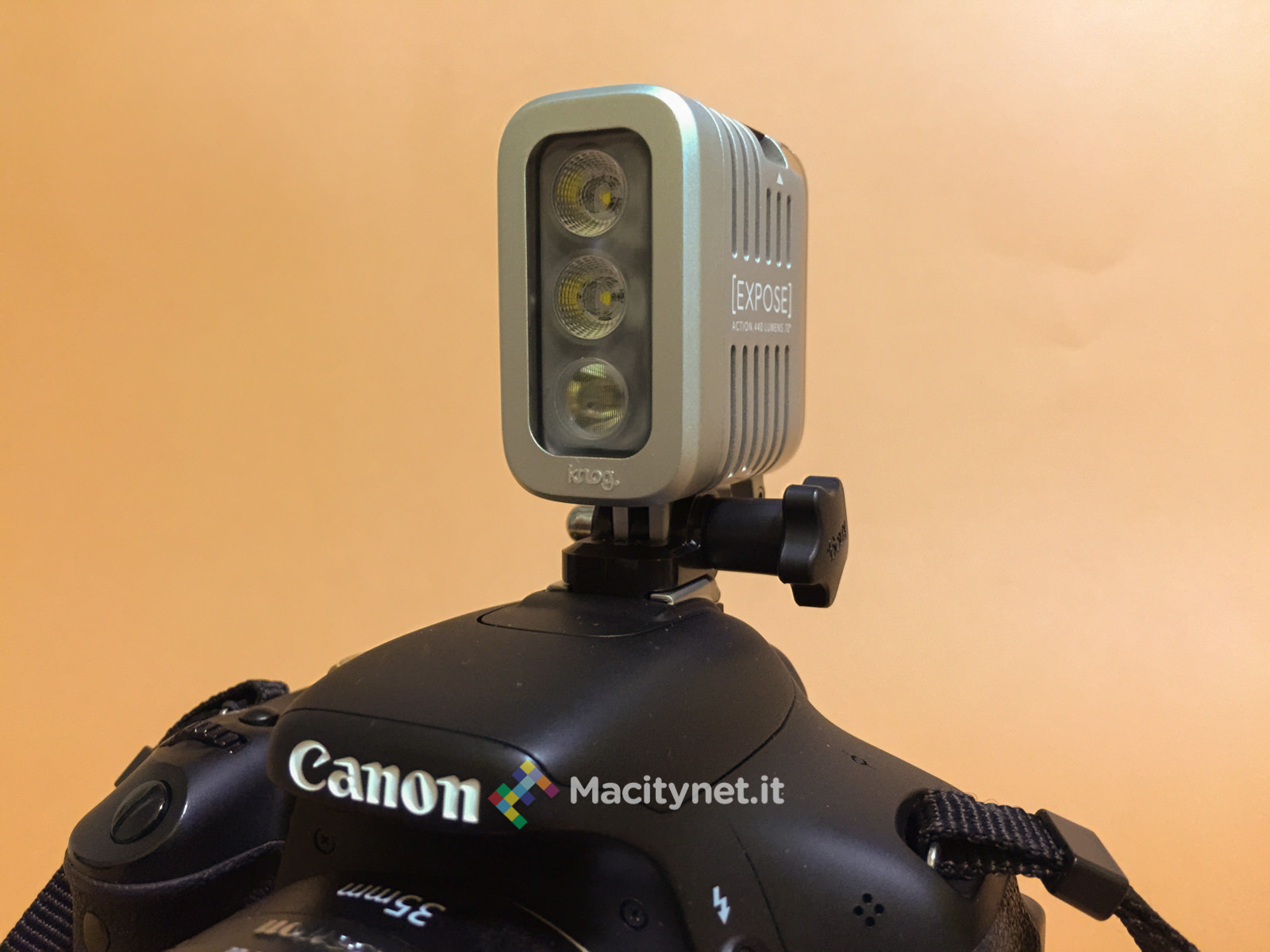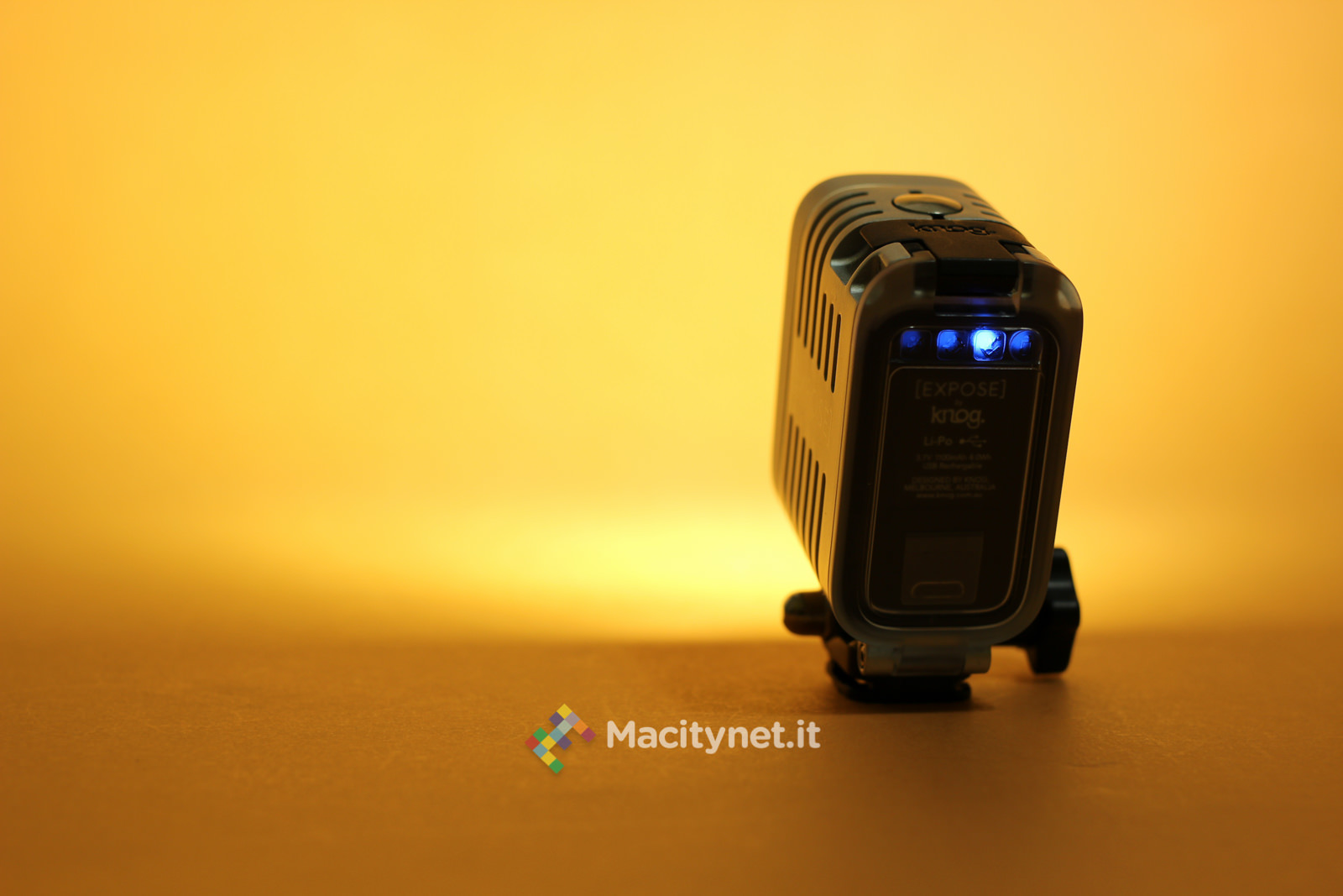 Questo a meno che non si decida di usare una torcia, scomoda però per chi magari sta facendo un’arrampicata, una passeggiata nel bosco, snorkeling in profondità o sta sciando ed ha le mani completamente impegnate. Se non si vuole rinunciare a registrare video con una telecamera del genere una possibile soluzione è affidarsi a Qudos Action, (nel modello da noi provato c’era ancora il vecchio nome, Expose) l’illuminatore LED di Knog ricaricabile venduto insieme ad un sistema di aggancio che la stabilizza affianco all’action camera, facilitando così l’orientamento del fascio di luce in direzione della ripresa.