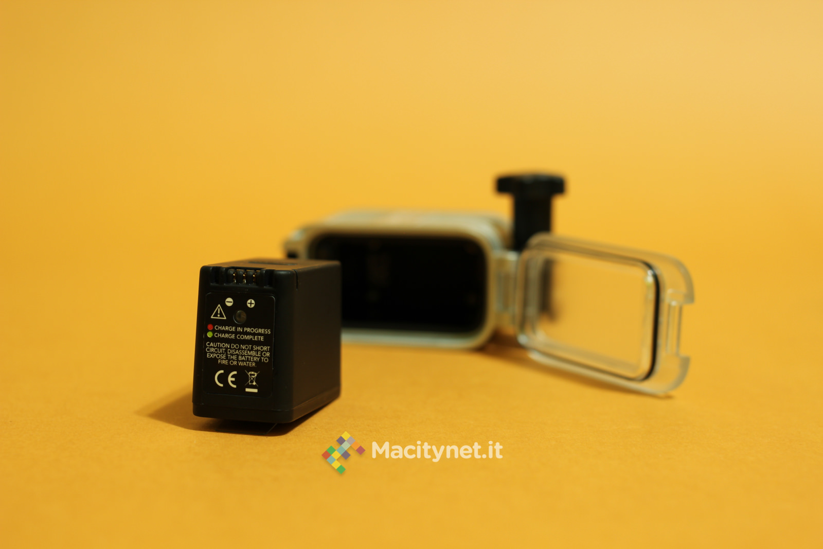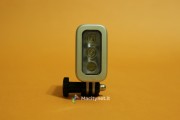 Sulla base troviamo il classico aggancio, come detto, compatibile con i sistemi di accessori GoPro e cloni cinesi, sulla superficie superiore troviamo invece l’unico tasto in metallo che ne regola l’accensione e la potenza delle varie luci, oltre alla clip in plastica che tiene ben chiuso il coperchio posteriore trasparente, dello stesso materiale, che si apre per accedere alla batteria integrata. Il coperchio è circondato da una guarnizione che permette di utilizzare il flash anche sott’acqua (fino a 40 metri secondo la scheda tecnica del produttore), perfetto per chi vuole registrare una nuotata in profondità, magari mentre pratica snorkeling.
