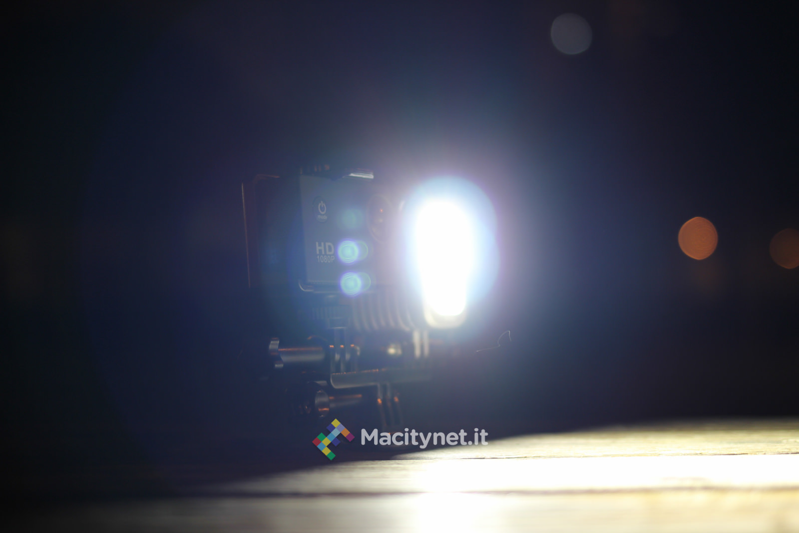 In base alle nostre prove, a piena potenza, quindi con 3 LED accesi al massimo, la batteria dura poco più di un’ora. Sebbene questa luce sia molto forte, nella maggior parte dei casi è sufficiente la modalità Ambient ad illuminazione ridotta (2 LED al 50% di potenza): le action camere, se utilizzate con gli automatismi, regolano automaticamente e di volta in volta l’esposizione in base alla luce generale. Con questa modalità si raggiungono facilmente le 4 ore di illuminazione continua, l’area illuminata è sufficientemente ampia e l’eventuale soggetto di fronte viene illuminato correttamente: con 3 luci infatti, in gran parte dei nostri test con SJ4000 il volto del soggetto di fronte veniva infatti spesso sovraesposto. Riteniamo che la modalità più potente possa rivelarsi particolarmente efficace in profondità in acqua o in zone davvero buie. Per un uso più casual le due luci LED a basso consumo si rivelano la combinazione vincente per un’ottima illuminazione, una corretta esposizione della camera e durata sufficiente per illuminare una serata di video.