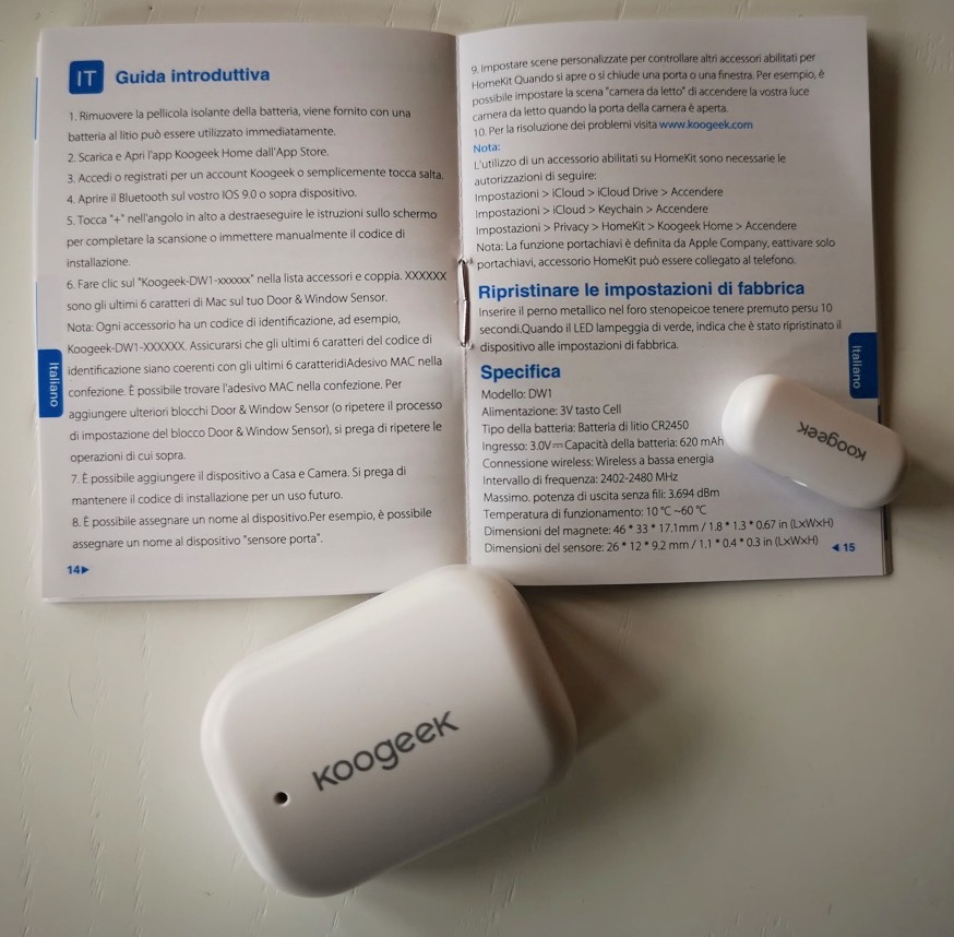 Nella confezione troviamo il corpo principale del sensore che ospita la batteria e l’elemento secondario che grazie al magnete di cui è dotato è in grado di attivare la chiusura del circuito che segnalerà la chiusura dell’infisso con una precisione di circa un cm: in pratica se i due componenti sono a meno di un centimetro di distanza verrà inviato un segnale di “chiuso” al sistema Homekit quando viene richiesto l’aggiornamento di stato del sensore stesso.