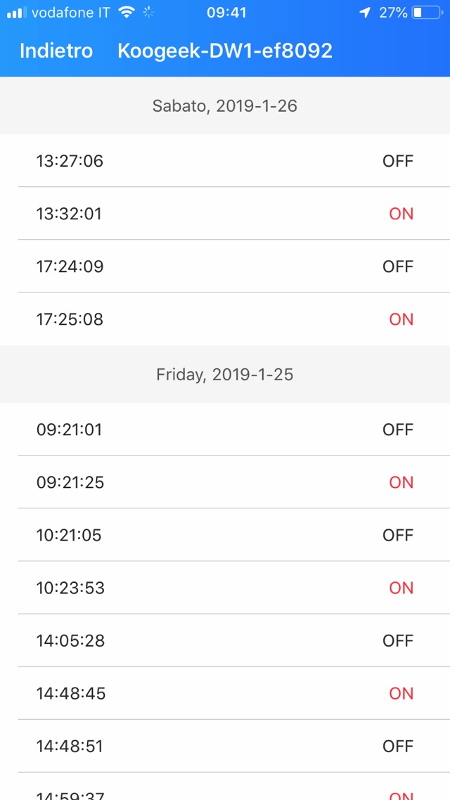 Se volete controllare quante volte e quando è rimasta aperta o chiusa una porta o una finestra (magari confrontandolo con i dati del riscaldamento o della qualità dell’aria) l’applicazione di Koogeek ha la possibilità di andare a leggere nella memoria del sensore gli ultimi 100 cicli di apertura registrati.