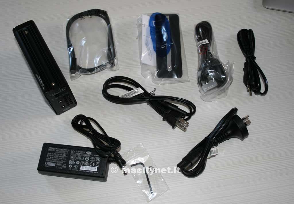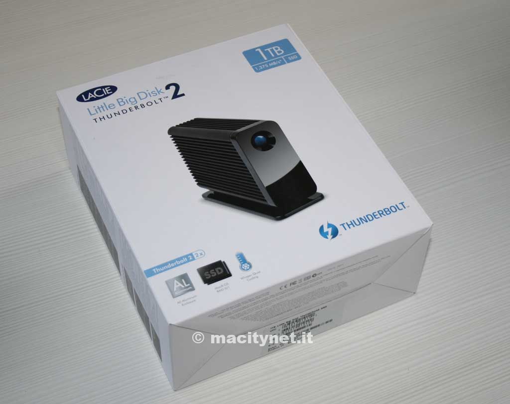 LaCie produce da tempo svariati dispositivi con connessione Thunderbolt e Thunderbolt 2. Il Little Big Disk che abbiamo avuto modo di provare (1249 euro su Apple Store) è l’ultima variante delle unità di storage portatili ad alte prestazioni. Aperta la confezione, all’interno di questa troviamo: l’alimentatore, quattro tipologie di cavi di alimentazione (inclusa la spina italiana), un cavo Thunderbot da 1 m, una basetta di alluminio che permette di tenere meglio in piedi il disco in verticale (bisogna farla scorrere nello slot situato nella parte inferiore dell’unità) e una chiave a brugola per avvitare la base al disco.