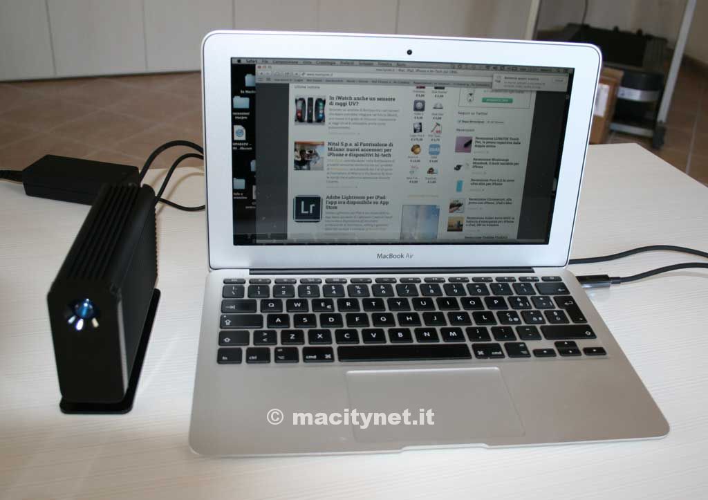 L’unità è veloce, velocissima, soprattutto se usata sulle macchine più recenti con Thunderbolt 2. Quest’ultima tecnologia offre versatilità e massima velocità di collegamento al computer. Se la prima generazione offriva velocità di trasferimento dati fino a 10 Gb/s bidirezionali, Thunderbolt 2 consente di raggiungere 20 Gb/s bidirezionali. La tecnologia in questione, inoltre, assegna priorità allo streaming di video mediante l’allocazione della larghezza di banda necessaria per la riproduzione. Questo è essenziale per la gestione di video e grafica 3D di fascia alta. Supponiamo di avere due streaming, un video 4K a 12 Gb/s e dati di 4 Gb/s. Mentre la tecnologia Thunderbolt di prima generazione potrebbe avere difficoltà nella gestion