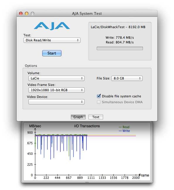 I test con Aja System Test su un MacBook Air 11″ Intel Core i5 con Intel HD Graphics 5000 hanno evidenziato velocità di lettura/scrittura fino a 804MB/S (limitate dalla connessione Thunderbolt di prima generazione). Sui Mac con connessione Thunderbolt di nuova generazione siamo riusciti ad arrivare a valori di 1200 MB/s in lettura e 1370MB/s in scrittura. I numeri promessi da LaCie sono dunque veritieri. Anche i test con BlackMagic Disk confermano l’estrema velocità del disco. Molto dipende ovviamente dalla configurazione RAID utilizzata (noi abbiamo eseguito i test con la modalità RAID 0, quella di default). Un test più empirico, come ad esempio, la copia di una cartella di 30GB usando la prima variante di Thunderbolt ha richiesto meno di un minuto.