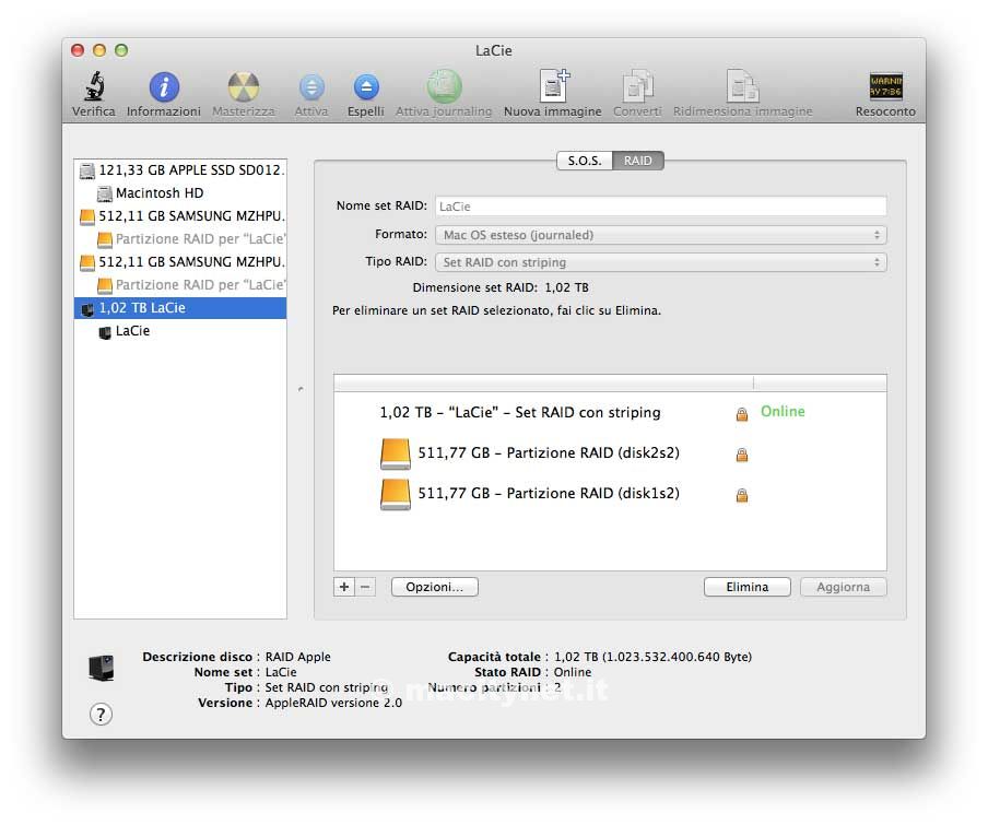 Tecnicamente l’unità è impostatala come RAID 0 con striping per ottimizzare l’uso e il throughput ed è inizializzato di fabbrica come HFS+ journaled. Lo storage è preconfigurato come un set RAID con striping (RAID 0). Da Utility Disco di OS X è possibile configurare il RAID come un set RAID in modalità mirroring (RAID 1) per la protezione dei dati. La configurazione come set RAID in modalità mirroring copia lo stesso file su ciascun disco, dimezzando la velocità di trasferimento dati e la capacità disponibile. Il set RAID con striping (RAID 0) accoppia le due unità dell’enclosure per massimizzare la velocità di trasferimento dati. I dati vengono memorizzati su entrambi i dischi configurati in coppia con striping in modo che possano condividere il carico di lettura e scrittura dei file. A differenza della configurazione speculare (mirror) con striping (RAID 1), la capacità di storage dei due dischi viene unificata per ottenere il massimo spazio possibile. Nel manuale allegato è ben spiegato come eventualmente creare un set RAID e vantaggi e svantaggi dell’una e dell’altra configurazione.