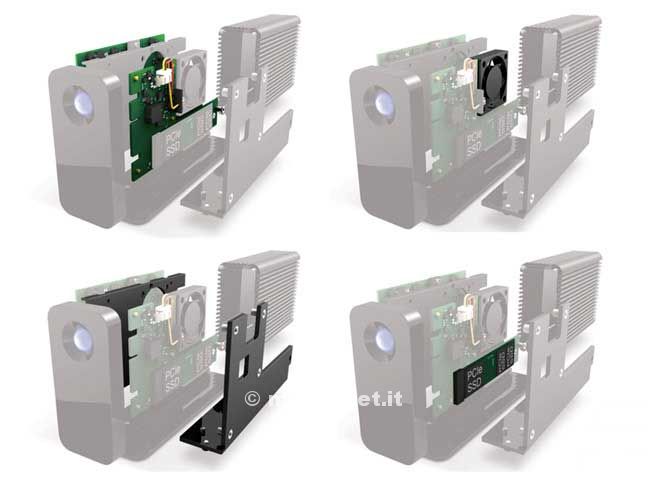 Per montare il volume nel computer basta collegare il cavo Thunderbolt in dotazione a una delle porte Thunderbolt 2 dell’enclosure, collegare l’altra estremità del cavo a una porta del computer compatibile con la tecnologia Thunderbolt, collegare l’alimentatore esterno in dotazione a una presa elettrica e alla porta di alimentazione dell’enclosure: il dispositivo si accende automaticamente e il volume viene montato nella scrivania.