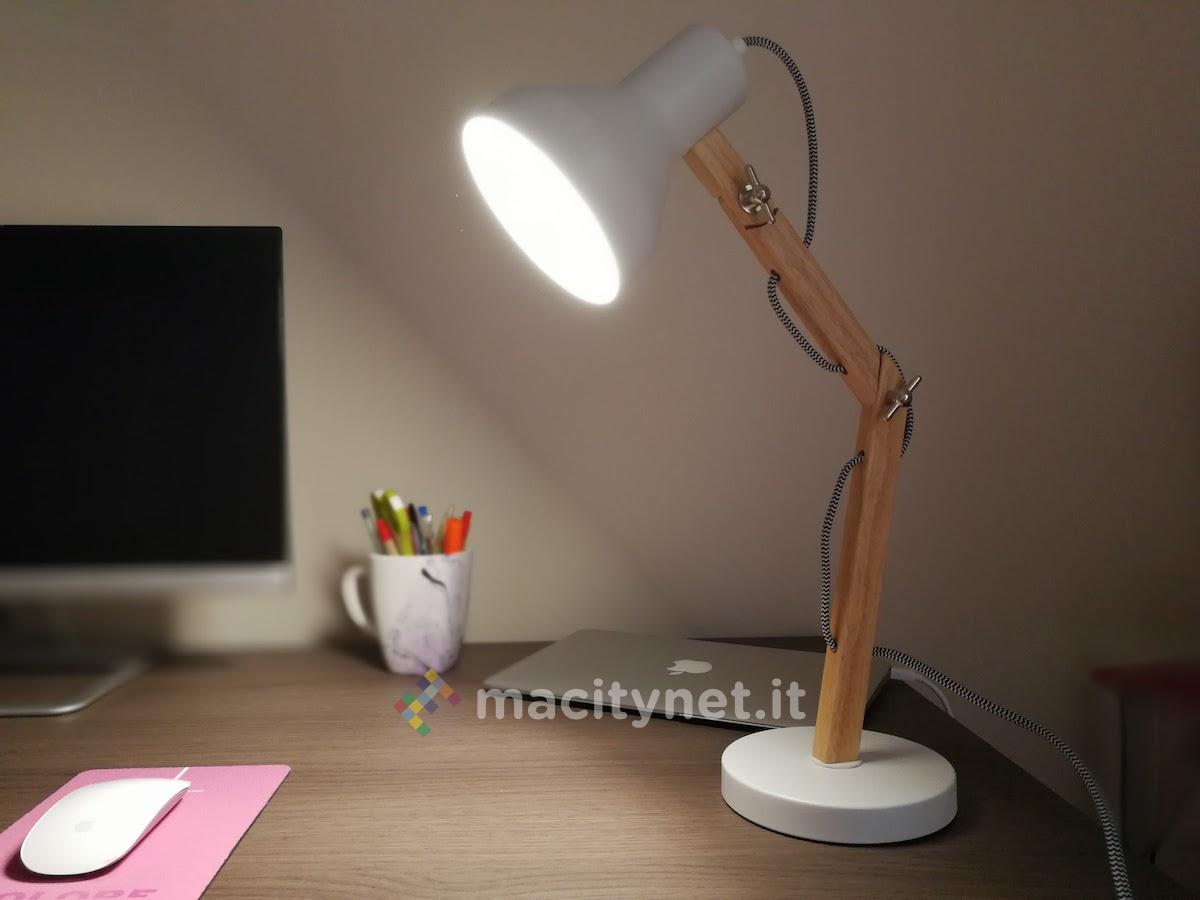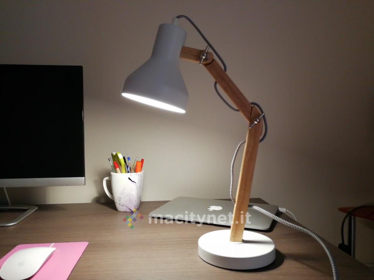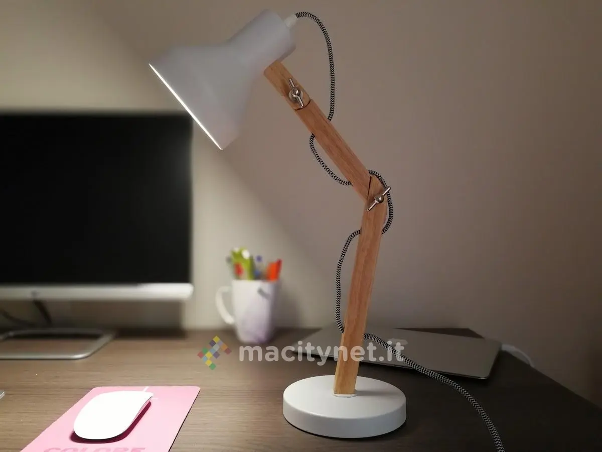 Al legno naturale del braccio si affianca anche il metallo, di pregevole fattura, robusto, ma al tempo stesso sottile e abbastanza leggero da non appesantire nel complesso l’estetica della lampada. In particolar modo, la versione in colorazione da noi testata, risulta essere molto elegante, in grado di essere realmente un complemento d’arredo, oltre che una lampada funzionale. Ha dimensioni piuttosto contenute, essendo alta appena 40 cm, e con una base di appena 13 centimetri. Questo vuol dire che la lampada risulta adatta anche a piccole postazioni, su scrivanie non molto ampie, ma allo stesso tempo è in grado di non sfigurare anche in ambienti ampi.