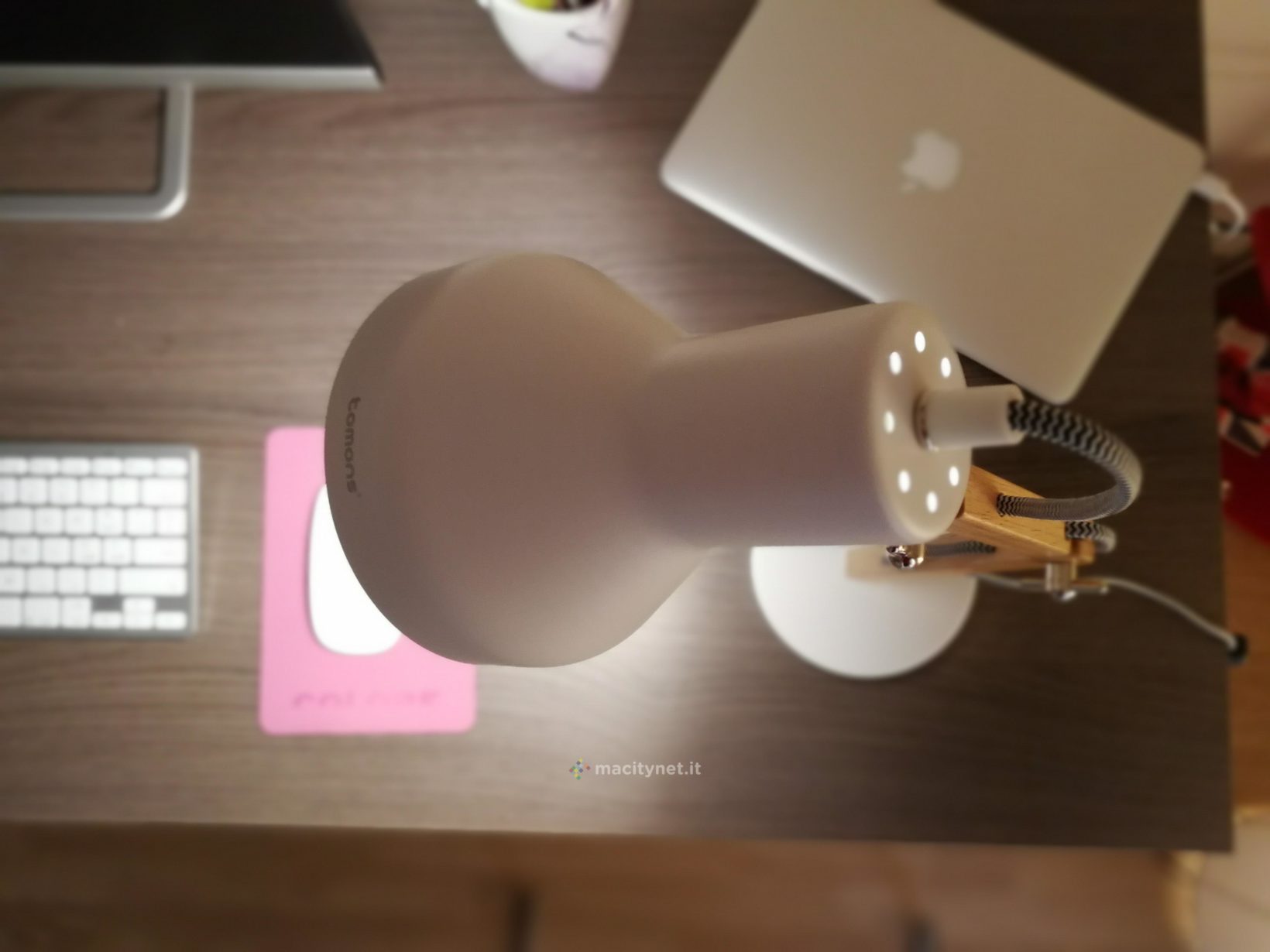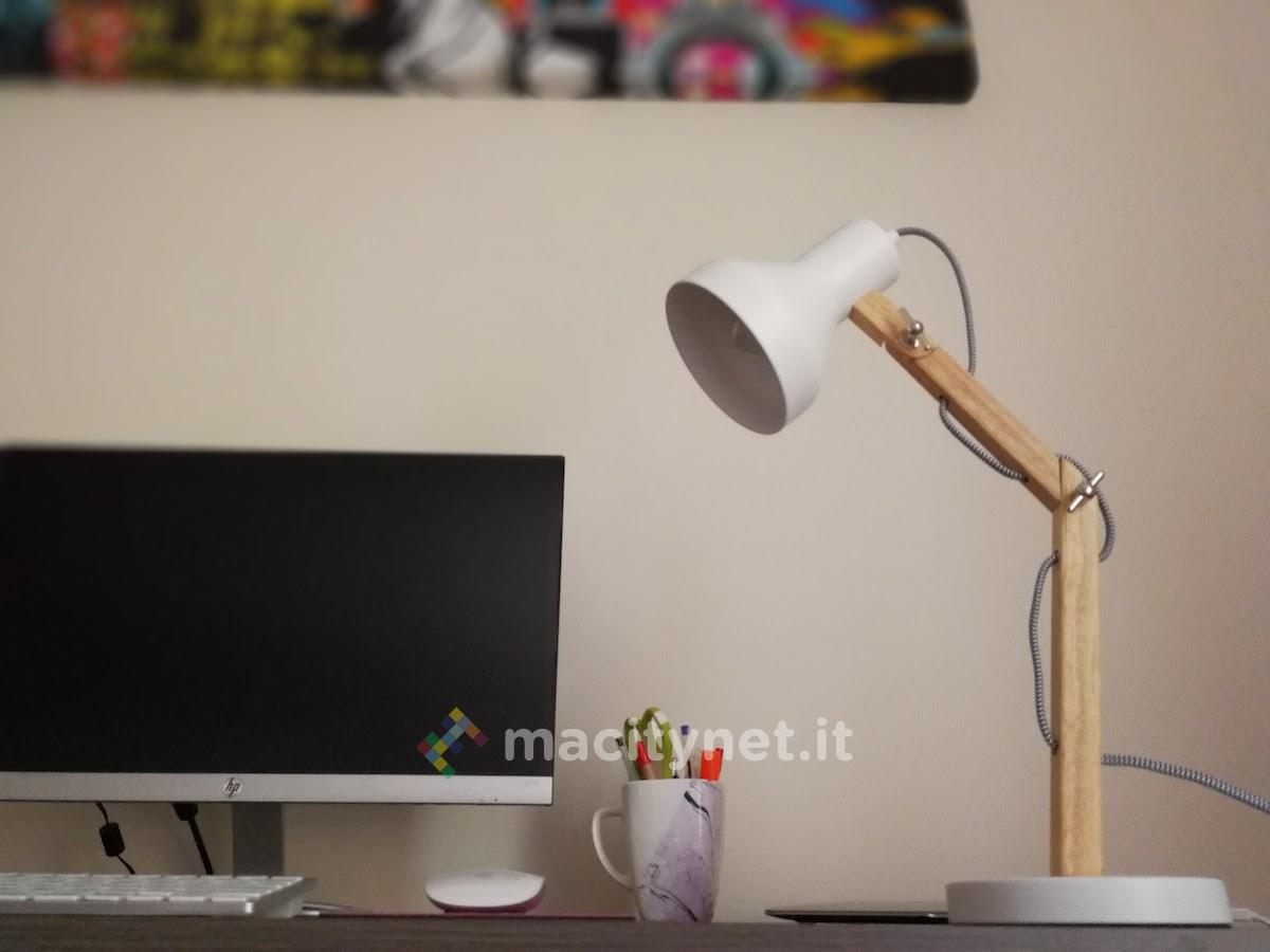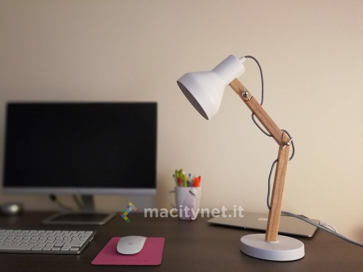 Al legno naturale del braccio si affianca anche il metallo, di pregevole fattura, robusto, ma al tempo stesso sottile e abbastanza leggero da non appesantire nel complesso l’estetica della lampada. In particolar modo, la versione in colorazione da noi testata, risulta essere molto elegante, in grado di essere realmente un complemento d’arredo, oltre che una lampada funzionale. Ha dimensioni piuttosto contenute, essendo alta appena 40 cm, e con una base di appena 13 centimetri. Questo vuol dire che la lampada risulta adatta anche a piccole postazioni, su scrivanie non molto ampie, ma allo stesso tempo è in grado di non sfigurare anche in ambienti ampi.