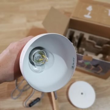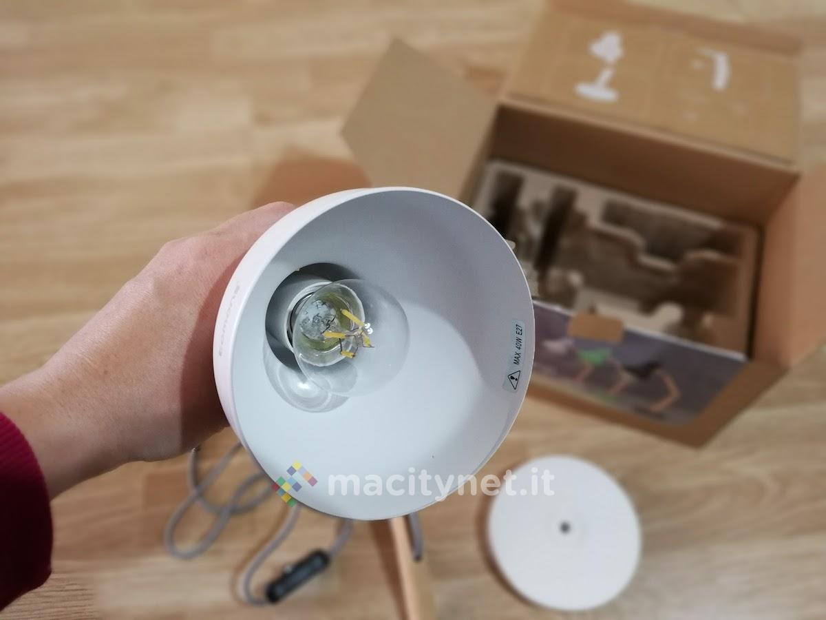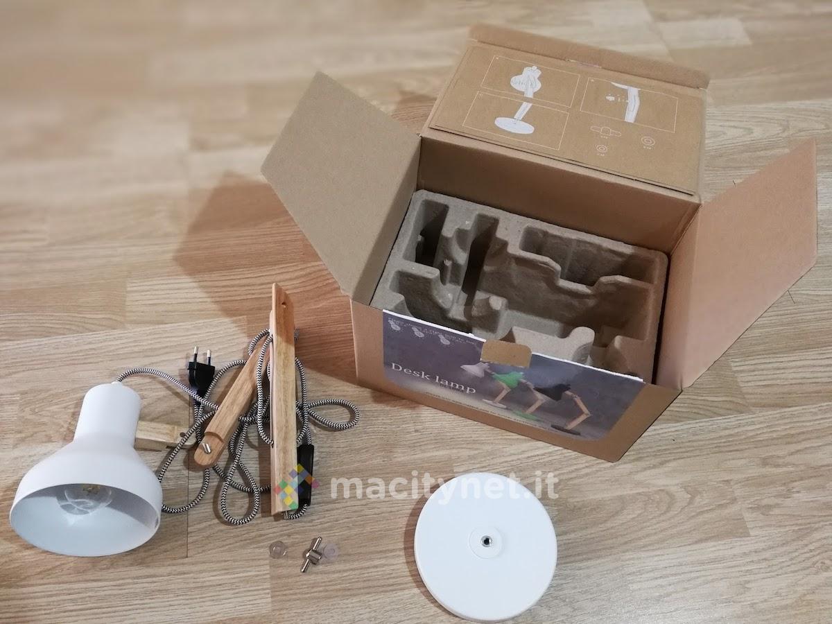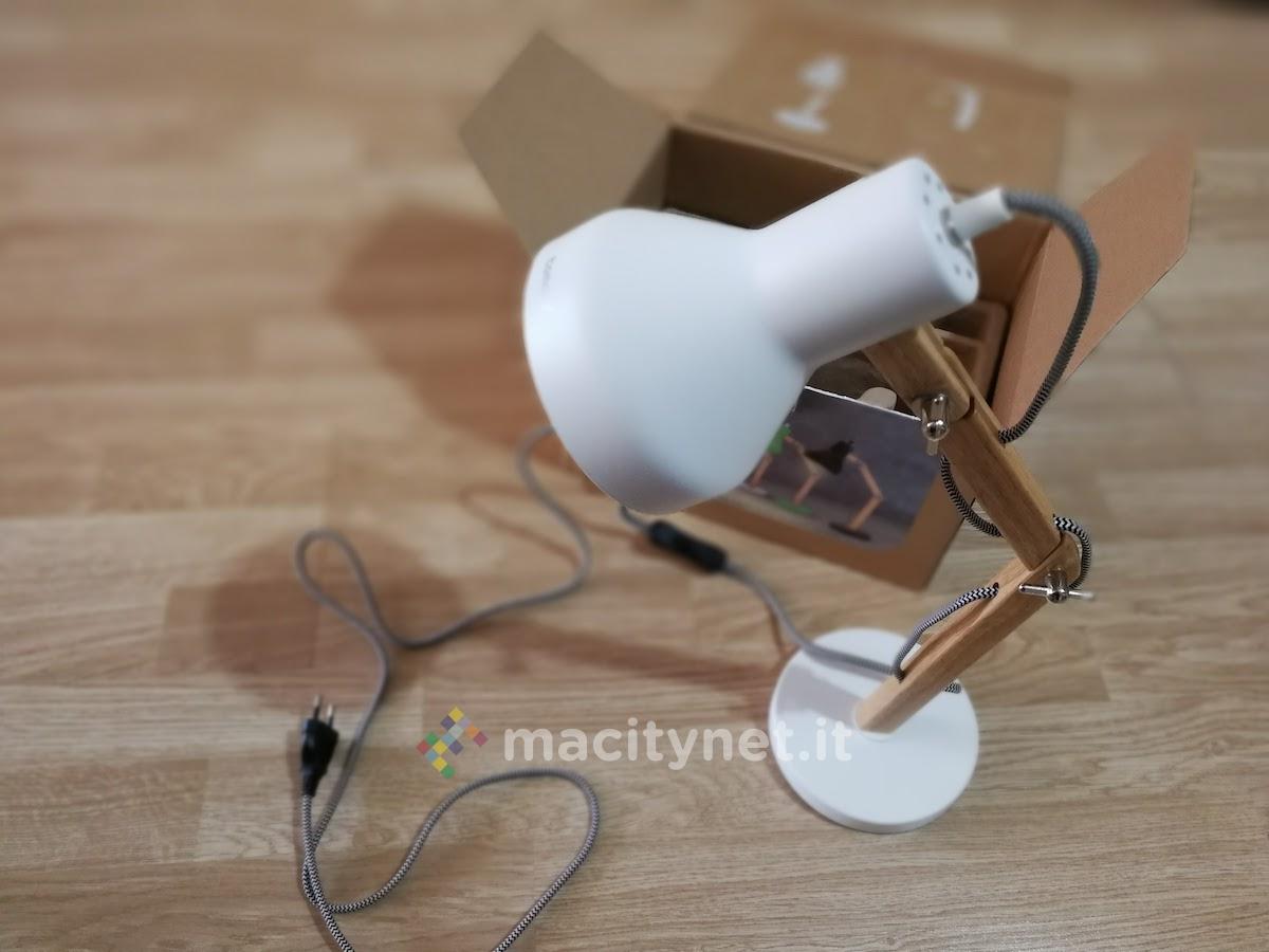 Un design semplice ed elegante, intramontabile e piuttosto classico, che grazie alle finiture in metallo, però, riesce ad adattarsi a qualsiasi ambiente. All’apertura della confezione di vendita la lampada risulta parzialmente smontata: sarà sufficiente montare il braccio in legno, avvitare i due perni, e fissarla alla base per essere pronta all’uso, anche grazie al bulbo al LED incluso nel bundle di vendita.