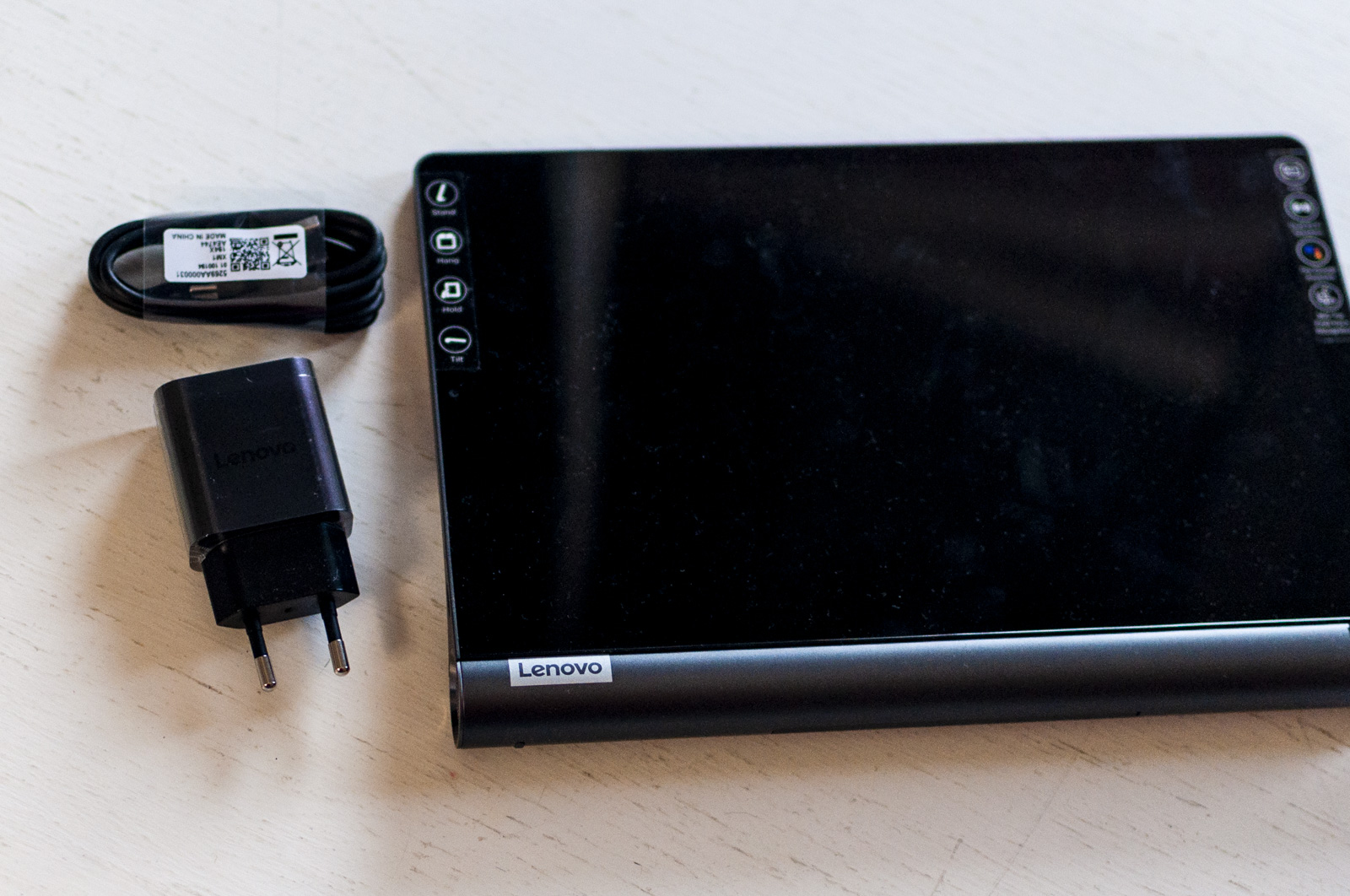 Il display, 10,1″, con IPS Full HD (1920 x 1080) con tecnologia TDDI appare particolarmente brillante ed è accompagnato da un corpo in metallo coperto nella parte posteriore da una gomma appena porosa, con la scritta Yoga in rilievo.