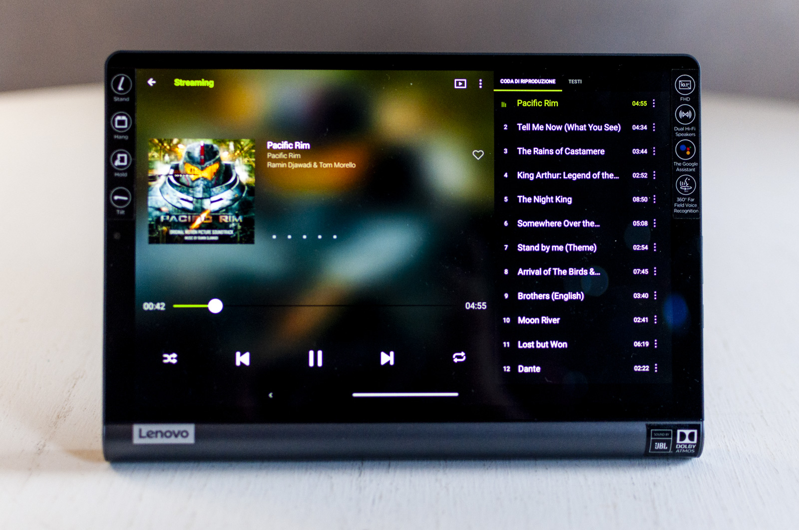 Oltre a questo, ci è piaciuto molto lo stand integrato, posto appena dietro, che permette di appoggiare il Lenovo Yoga Smart Tab in orizzontale su un tavolo al volo, come di essere appeso ad un gancio e funzionare ruotato di 180°.