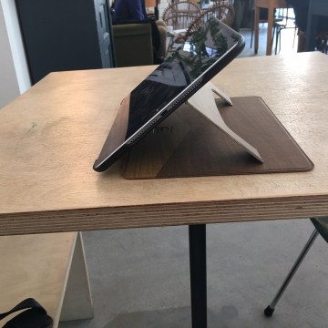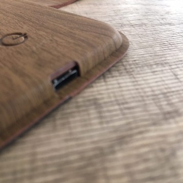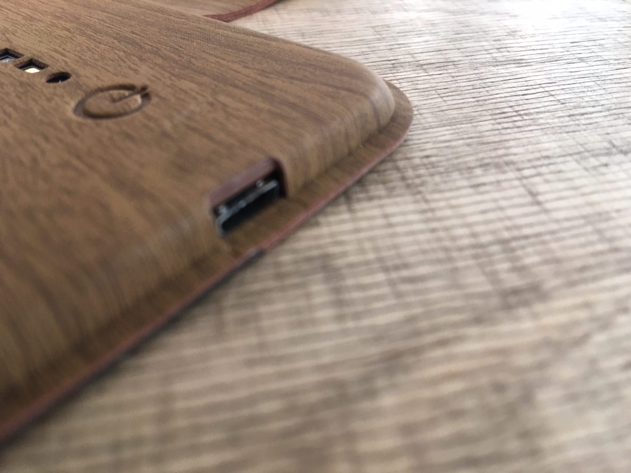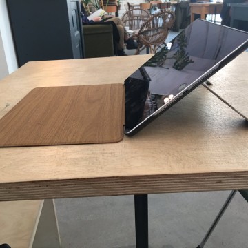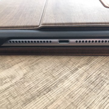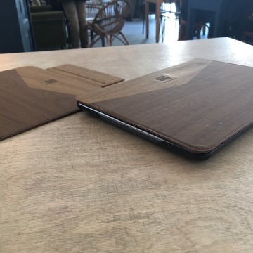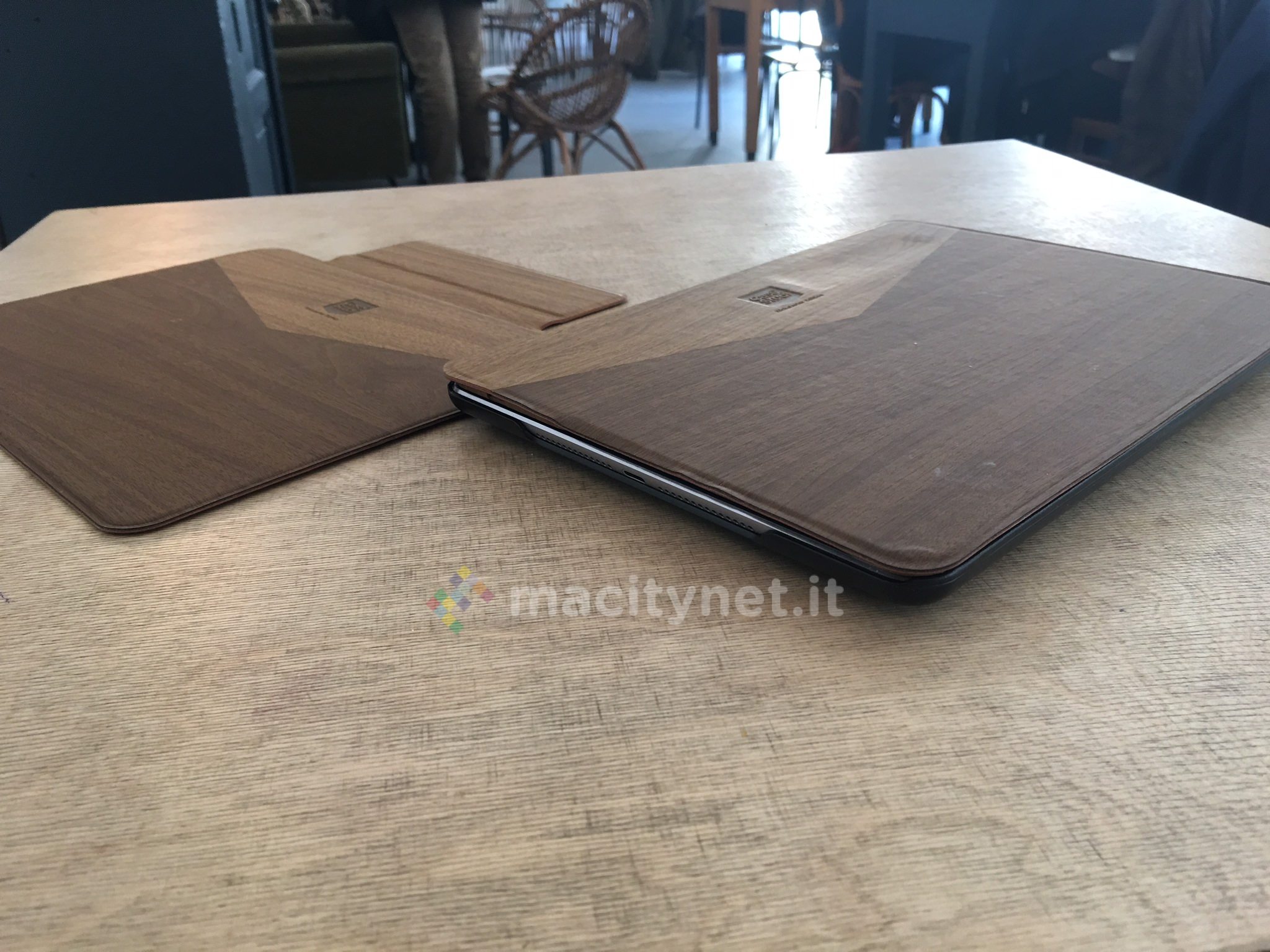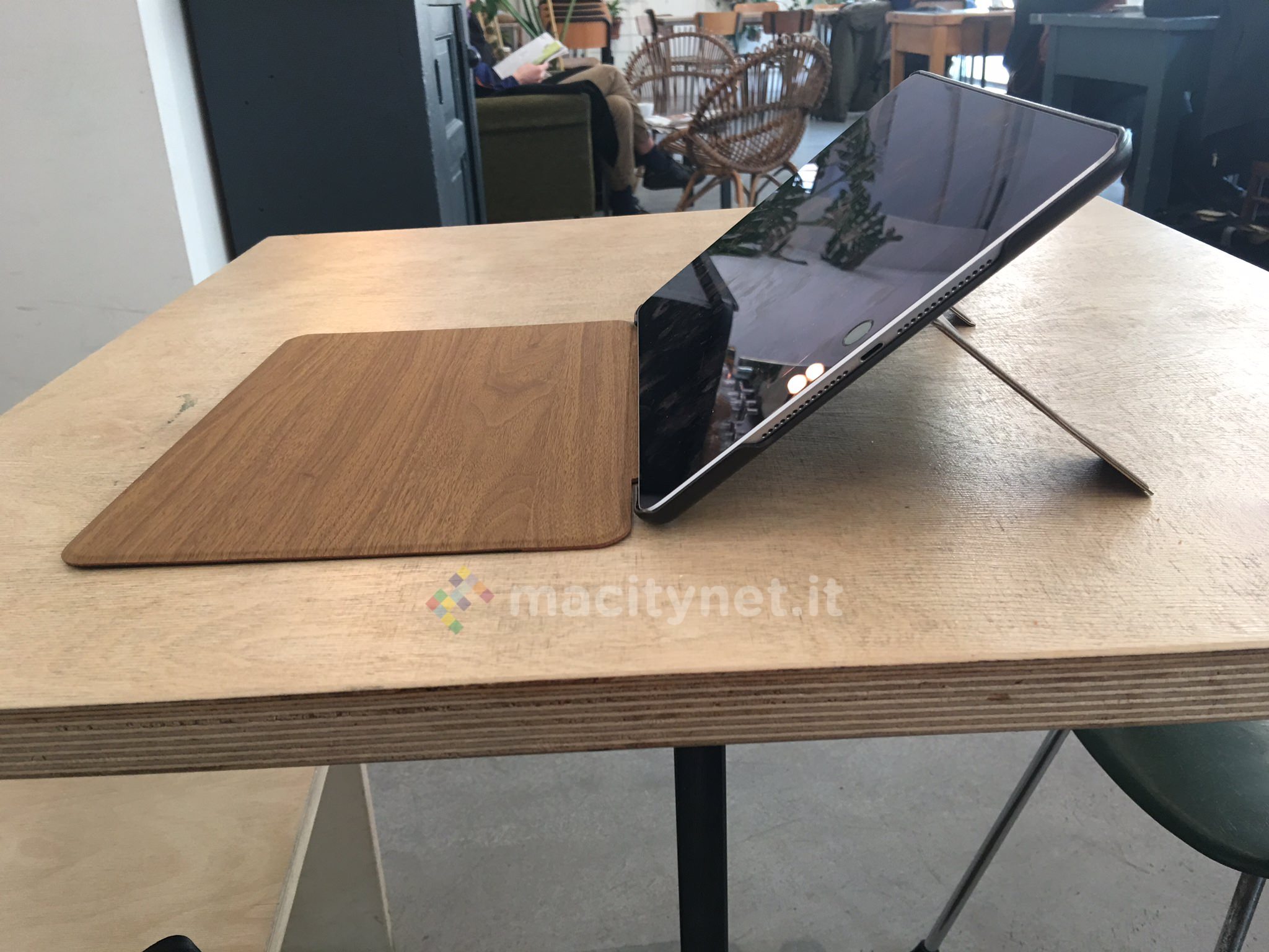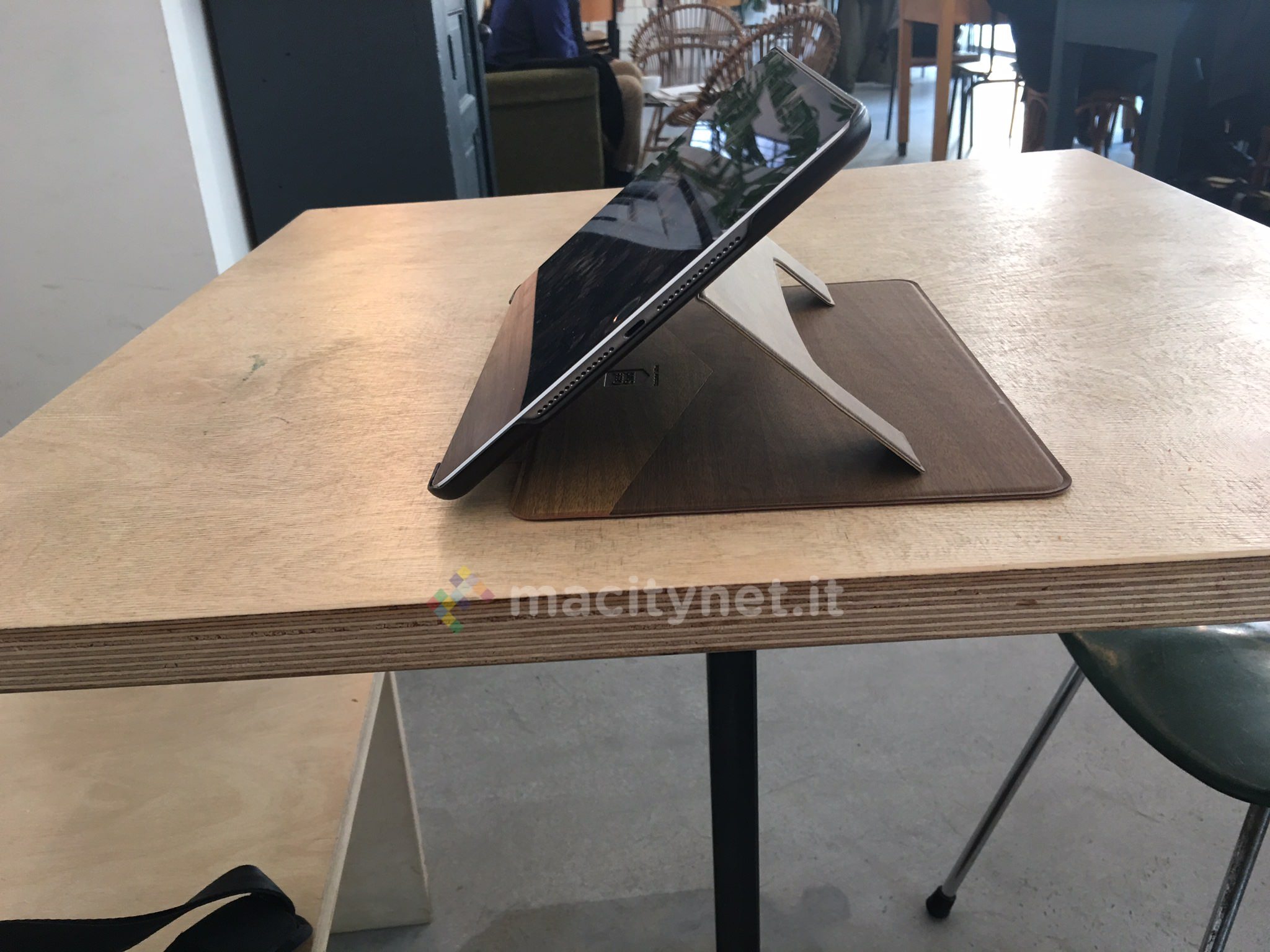 La parte che si solleva è la “stampella” dell’iPad se si vuole tenerlo in posizione rialzata ad esempio per guardare un video oppure per scrivere è modellata a a doppio appoggio. Lo spazio vuoto che rimane al suo interno è ben pensato per essere quello dove agganciare la cover magnetica. In questo modo si ha la possibilità di avere un approccio modulare e al tempo stesso si risolvono con eleganza problemi di allineamento.