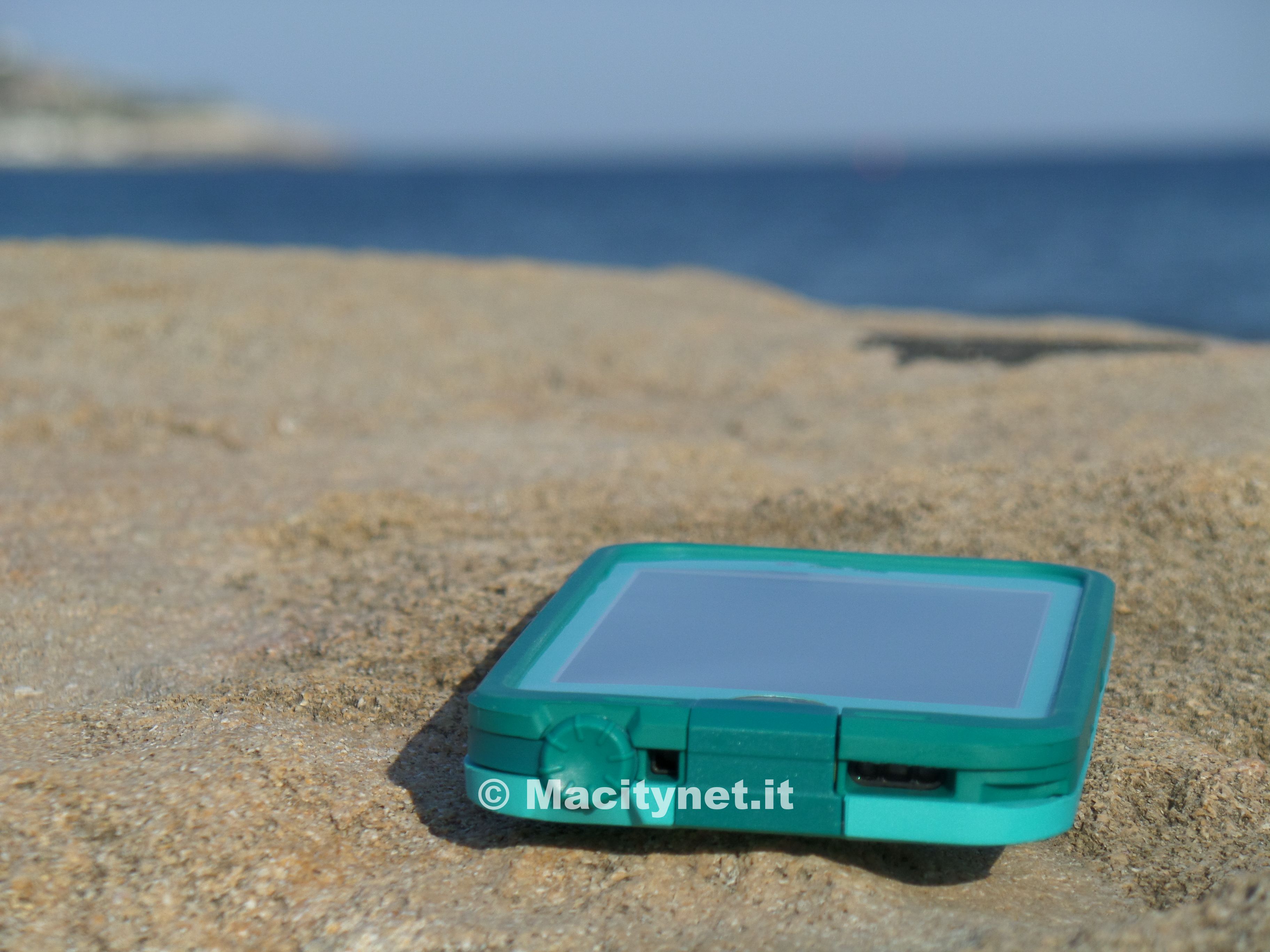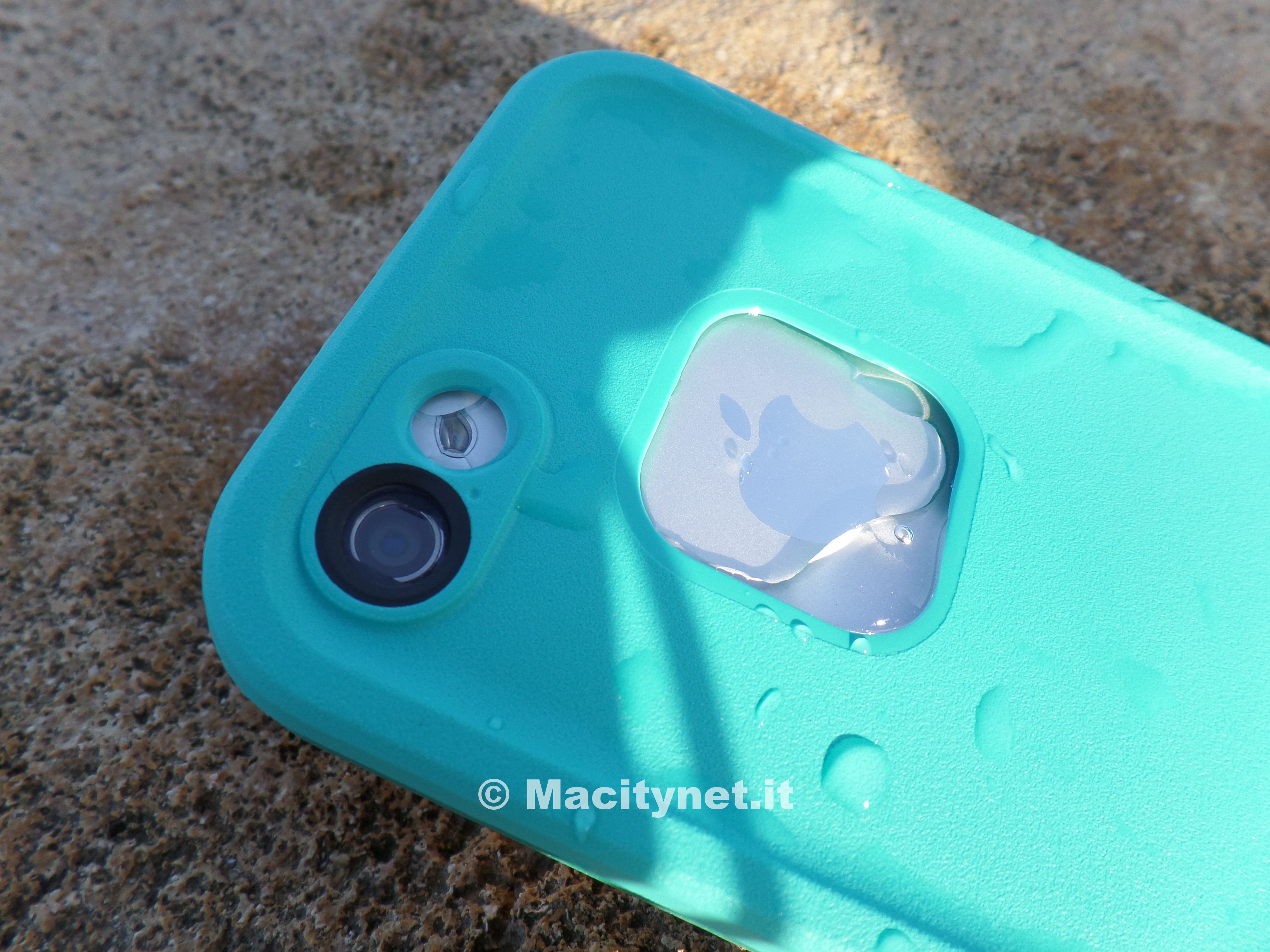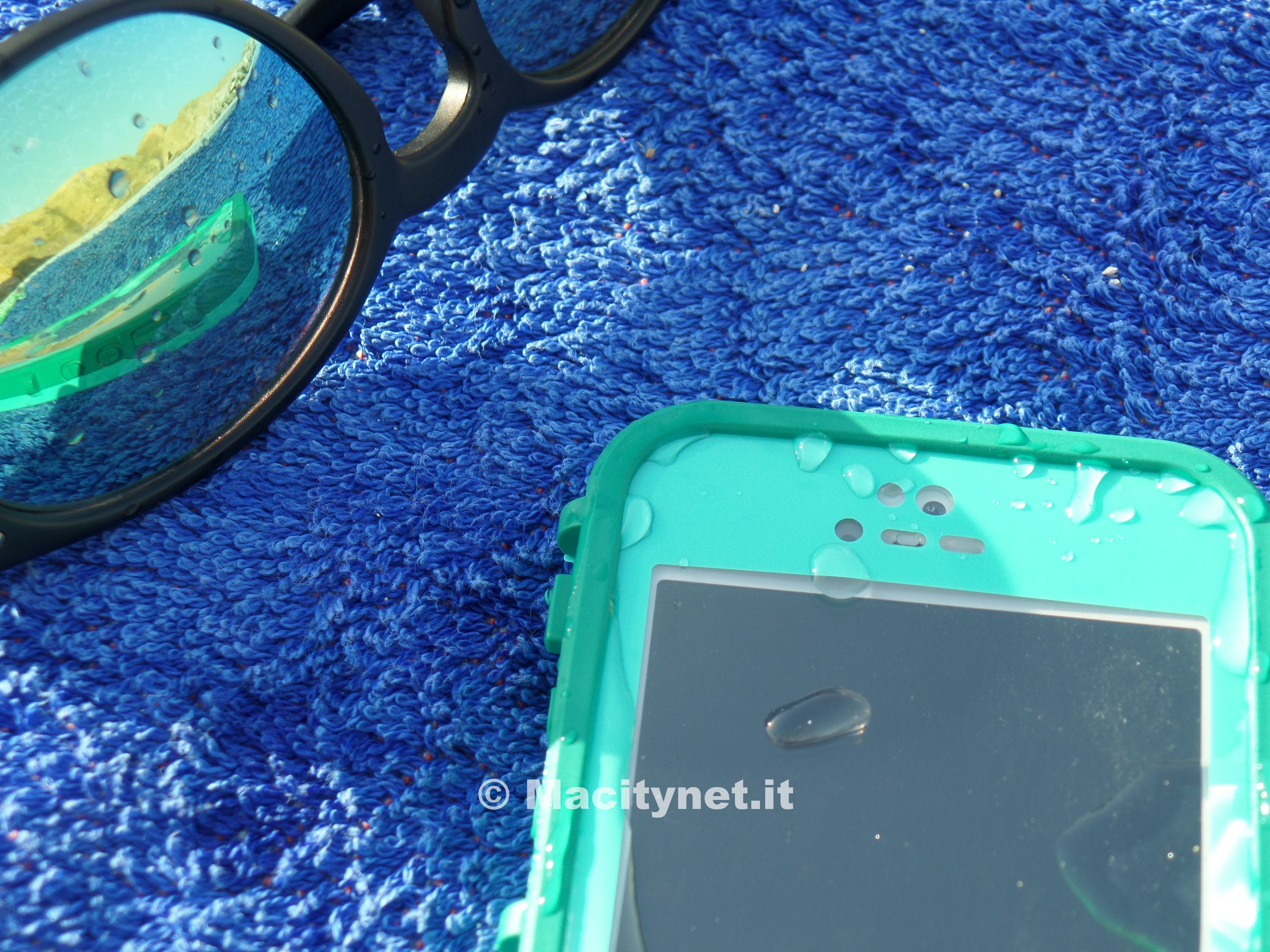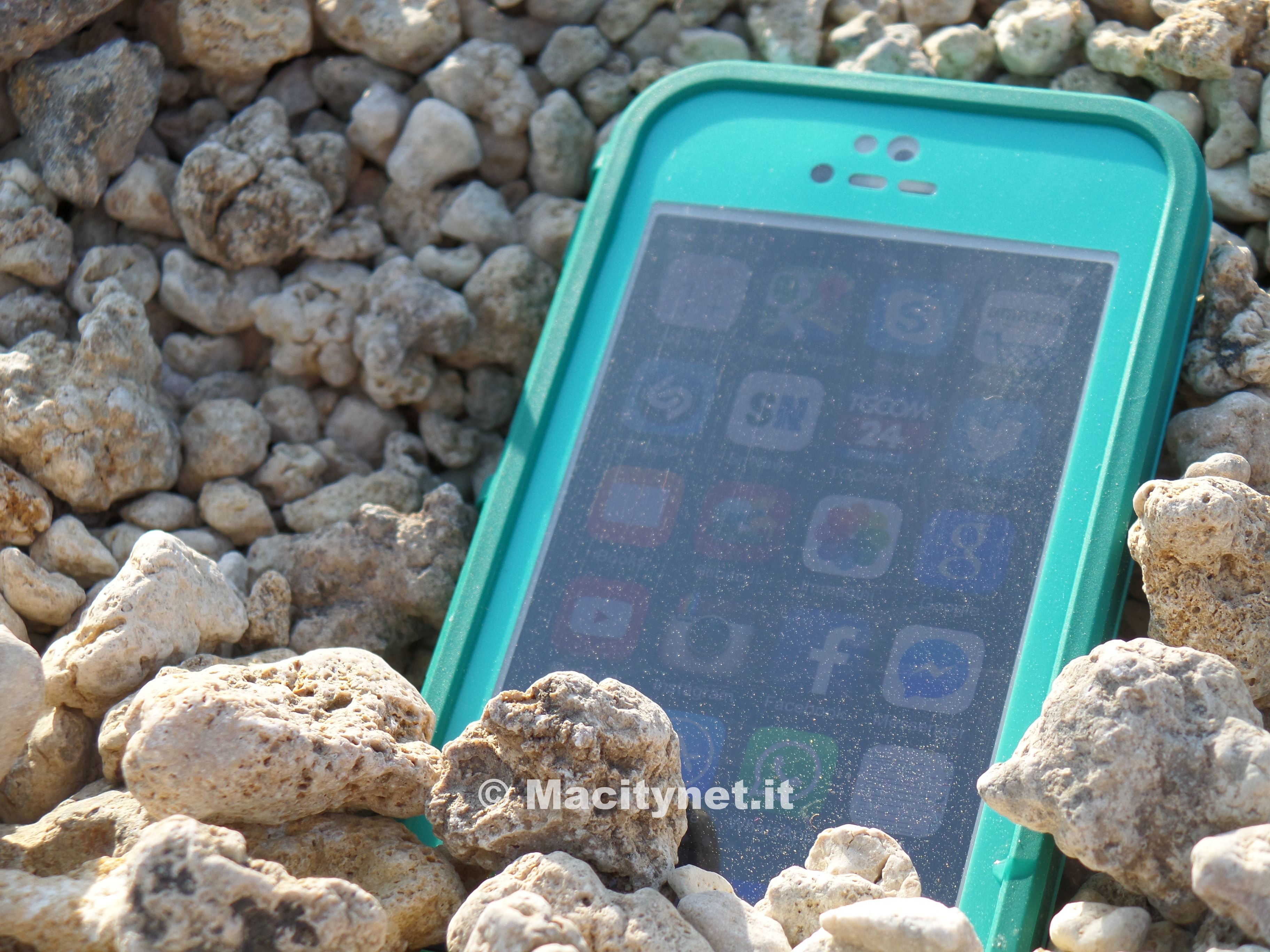 Il touchscreen risponde molto bene sott’acqua ed è possibile scattare facilmente foto o effettuare filmati. Solo quando l’iPhone riemerge, naturalmente, le numerose gocce presenti sul display ostruiscono leggermente gli input dell’utente, dato che il touchscreen reagirà anche alle gocce presenti e non riconoscerà perfettamente il tocco del dito. Qualità di filmati e foto è eccellenze: in condizioni normali non risentono quasi della presenza della cover, mentre sott’acqua la qualità viene ovviamente influenzata dalla pulizia del mare o della piscina nella quale si immerge la cover. Durante le nostre prove abbiamo immerso iPhone senza problema alcuno, senza risparmiare il dispositivo alle onde e senza troppo preoccuparci di urti con scogli o pietre. Lifeproof Fre non sembra davvero avere punti negativi ed è difficile riscontrare qualche contro. Giusto a voler essere pignoli, è possibile ravvisare l’assenza di un piccolo gancio esterno, che avrebbe consentito di agganciare un laccetto per trasportare l’iPhone al collo.