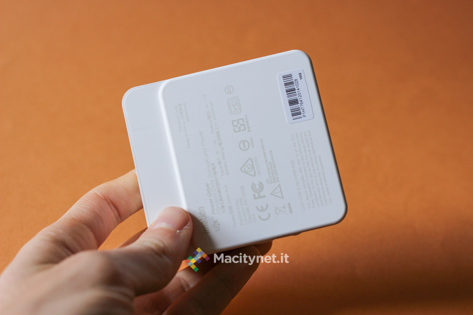 Il corpo è interamente in plastica, liscia lungo i bordi e satinata su entrambe le superfici, quella superiore in grigio dove troviamo il tasto Riattiva con i 4 LED che indicano lo stato di carica del dispositivo, bianco è il colore della superficie inferiore dove sono invece stampate le specifiche tecniche.
