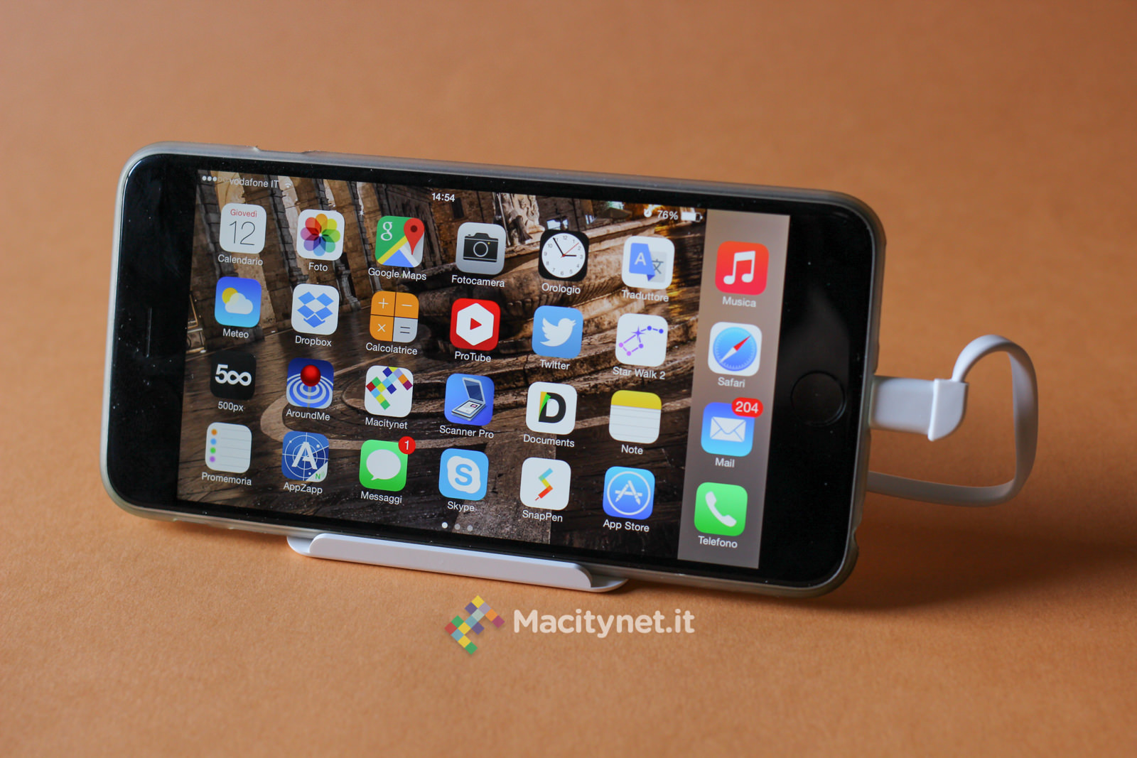 Una delle prime cose che si notano è la presenza del connettore Lightning: di fatto è compreso di cavo, incassato lungo i bordi, in modo da permettere di collegare l’iPhone in qualsiasi momento e senza bisogno di portare con sé altri accessori. La lunghezza è sufficiente per permettere di collegarlo a qualsiasi smartphone, anche al più grande ed ingombrante iPhone 6 Plus, mentre lo si mantiene inclinato in posizione Landscape grazie al piccolo vassoio estraibile dalla base che ha la semplice funzione di stand. Quest’ultima, inaspettata ed apprezzata per il mimetismo e l’utilità, sporge di 1,5 centimetri, sufficienti per sorreggere tranquillamente l’iPhone anche con una custodia grazie al piccolo dente che ne blocca lo scivolamento.