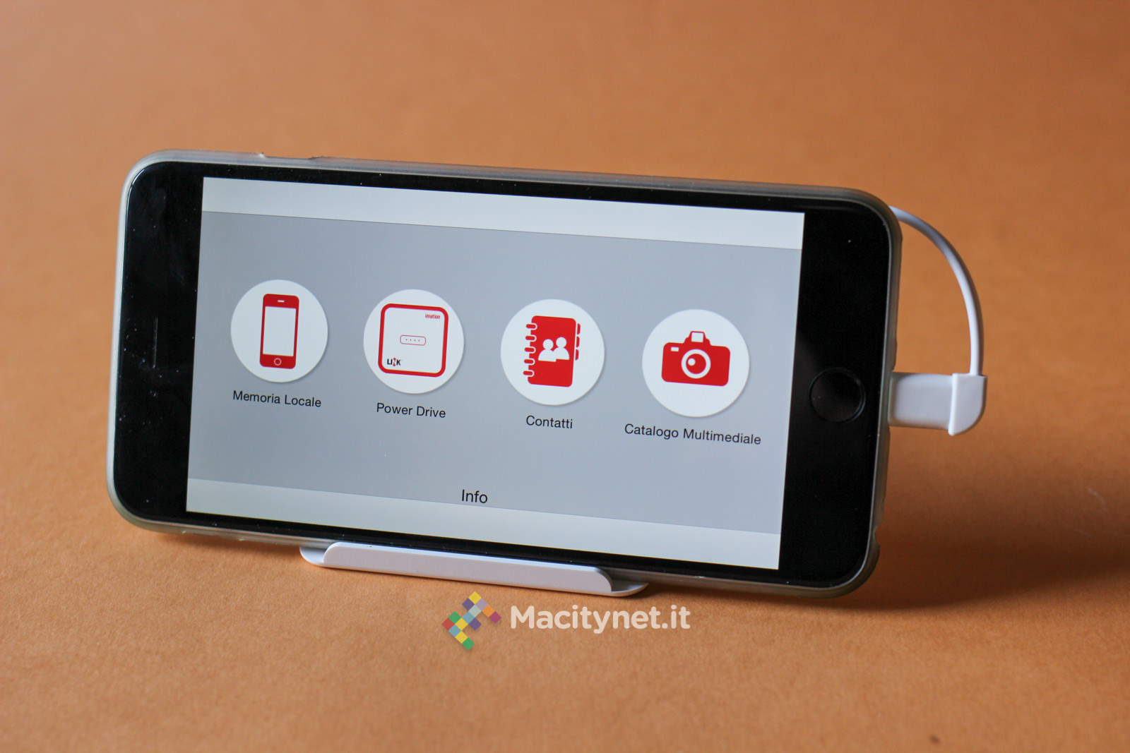 L’app non ha bisogno di particolari spiegazioni d’uso. Nella schermata principale troviamo quattro grandi pulsanti per accedere a quattro diverse funzioni: Memoria Locale, Power Drive, Contatti e Catalogo Multimediale, oltre al pulsante Info in basso dove è possibile rintracciare la Guida utente, la versione software e firmware, il pulsante per aggiornare quest’ultimo e quello per dare un’occhiata a quanto spazio ha l’iPhone e quanto ne resta ancora libero, oltre al pulsante tradotto erroneamente in “Formato” visto che in realtà serve per formattare l’unità. Riguardo quest’ultima, precisiamo che la versione in prova è da 16 GB ma è disponibile anche in modelli più capienti da 32 GB e 64 GB.