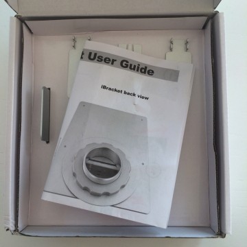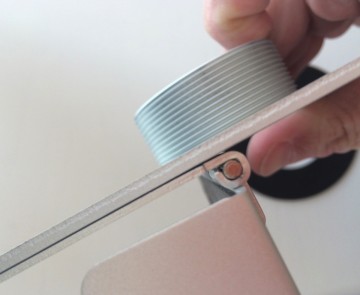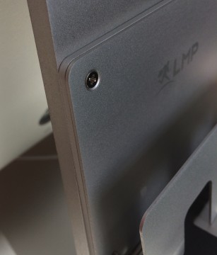 La maggior parte delle parti è in in alluminio satinato e ben si sposa con le finiture del supporto di iMac mentre la termoplastica del sistema di avvitamento ha colori sufficientemente in linea con il resto del supporto metallico. Il sistema è “ribaltabile” grazie ad una cerniera ed è conformato ad “L” per fornire una battuta al dispositivo che ospita e non farlo sfilare dalla mensola.