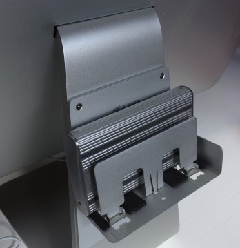 La staffa si è dimostrata ben solida e molto comoda per l’uso previsto e potrebbe essere anche l’occasione per montare un secondo fisco SSD o tradizionale da gestire con la modalità Fusion Drive. Visto che si sfrutta il posizionamento in verticale delle periferiche la sponda laterale è un ottimo sistema per evitare disastrosi ribaltamenti magari in fase di pulizia del retro dello schermo o per qualche cavo spostato per sbaglio.