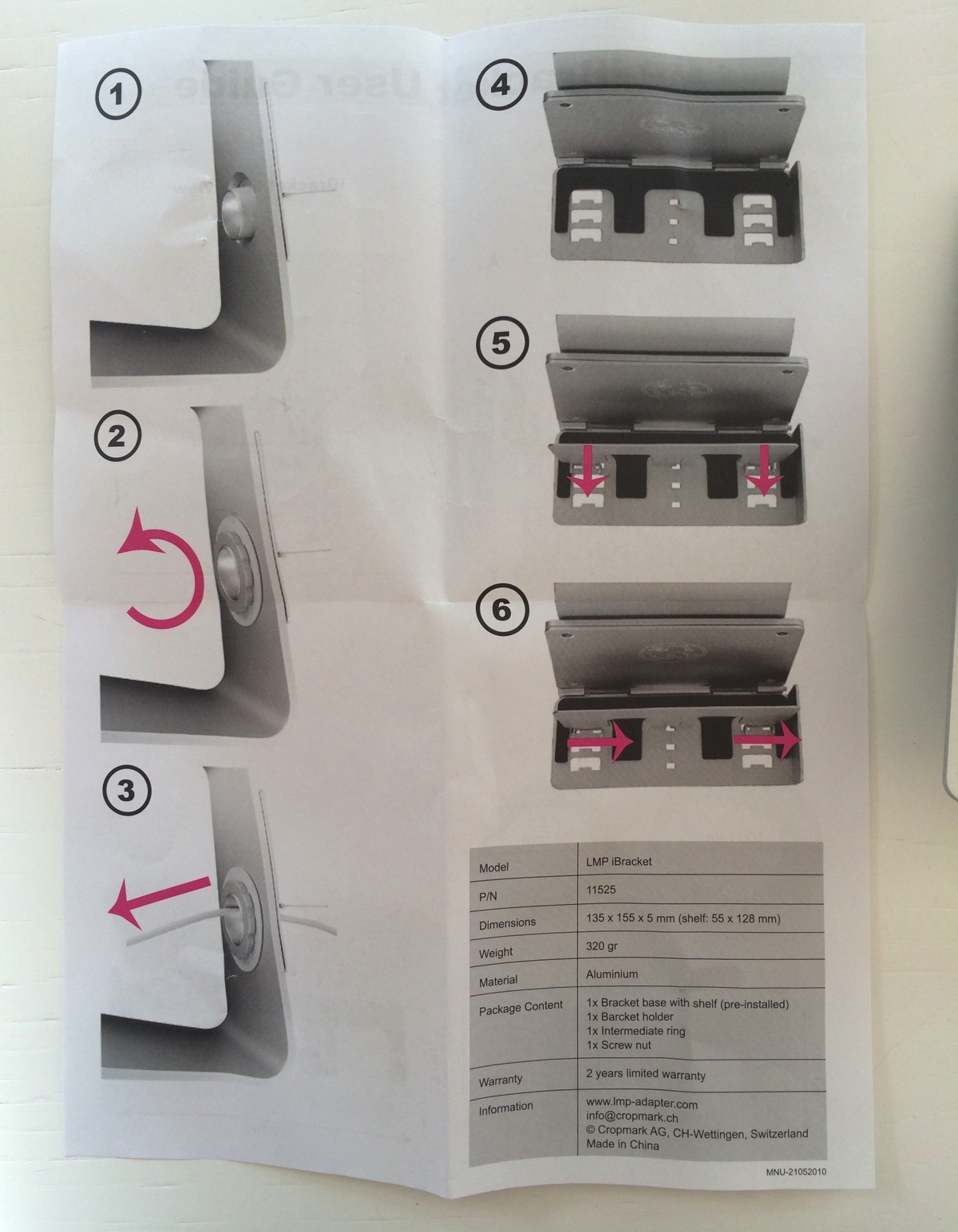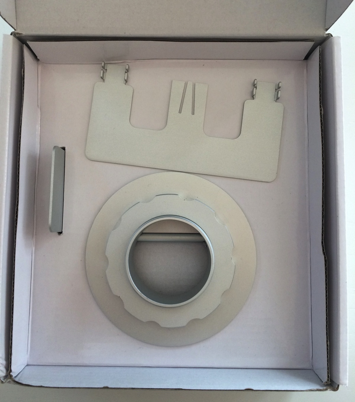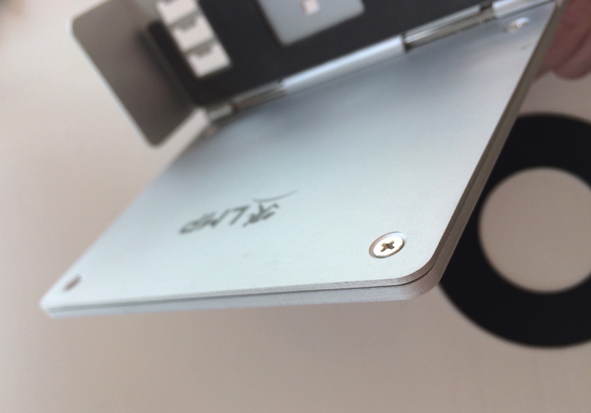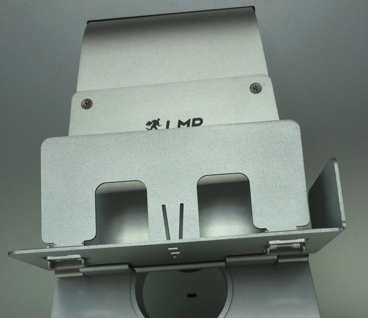 La maggior parte delle parti è in in alluminio satinato e ben si sposa con le finiture del supporto di iMac mentre la termoplastica del sistema di avvitamento ha colori sufficientemente in linea con il resto del supporto metallico. Il sistema è “ribaltabile” grazie ad una cerniera ed è conformato ad “L” per fornire una battuta al dispositivo che ospita e non farlo sfilare dalla mensola.