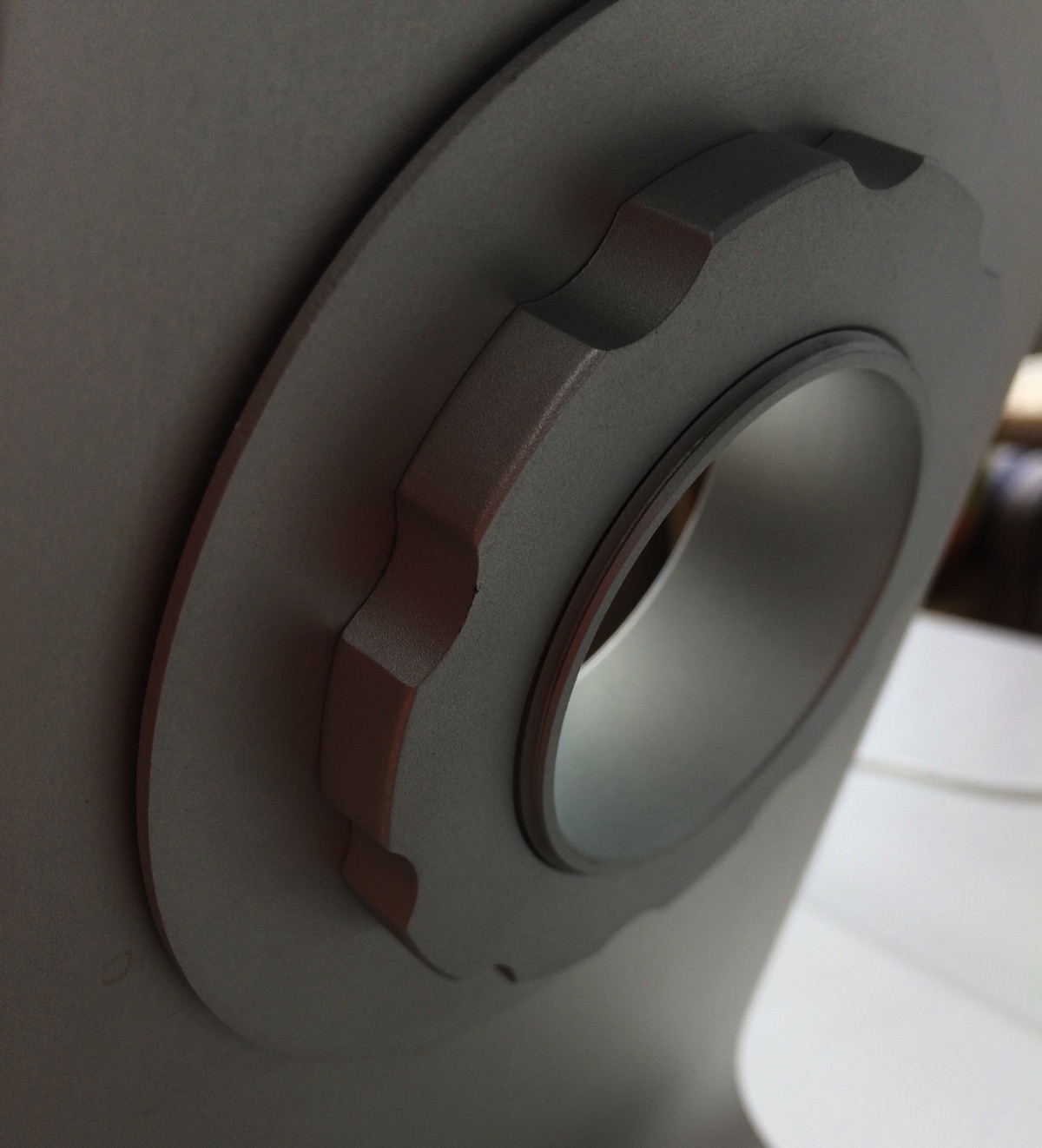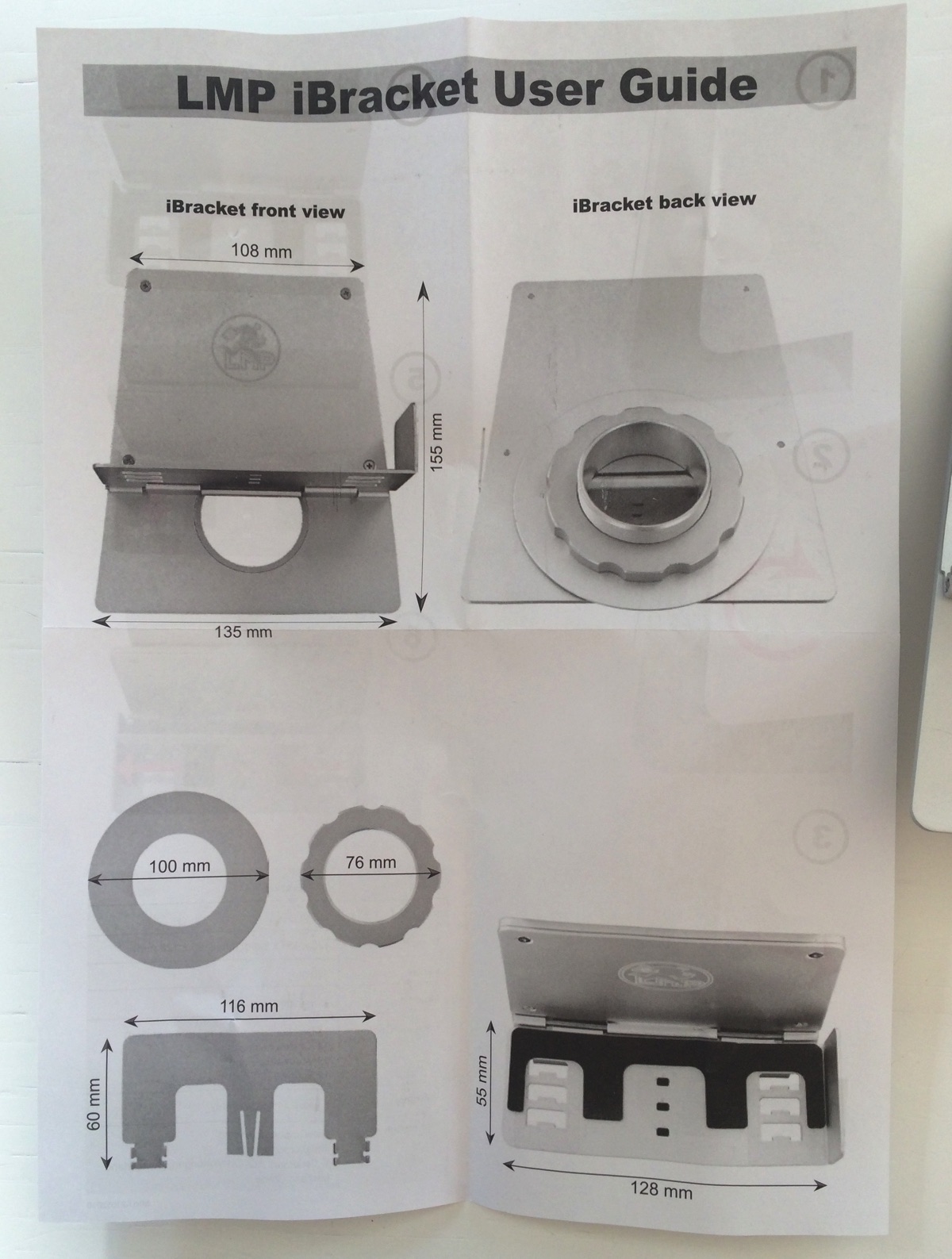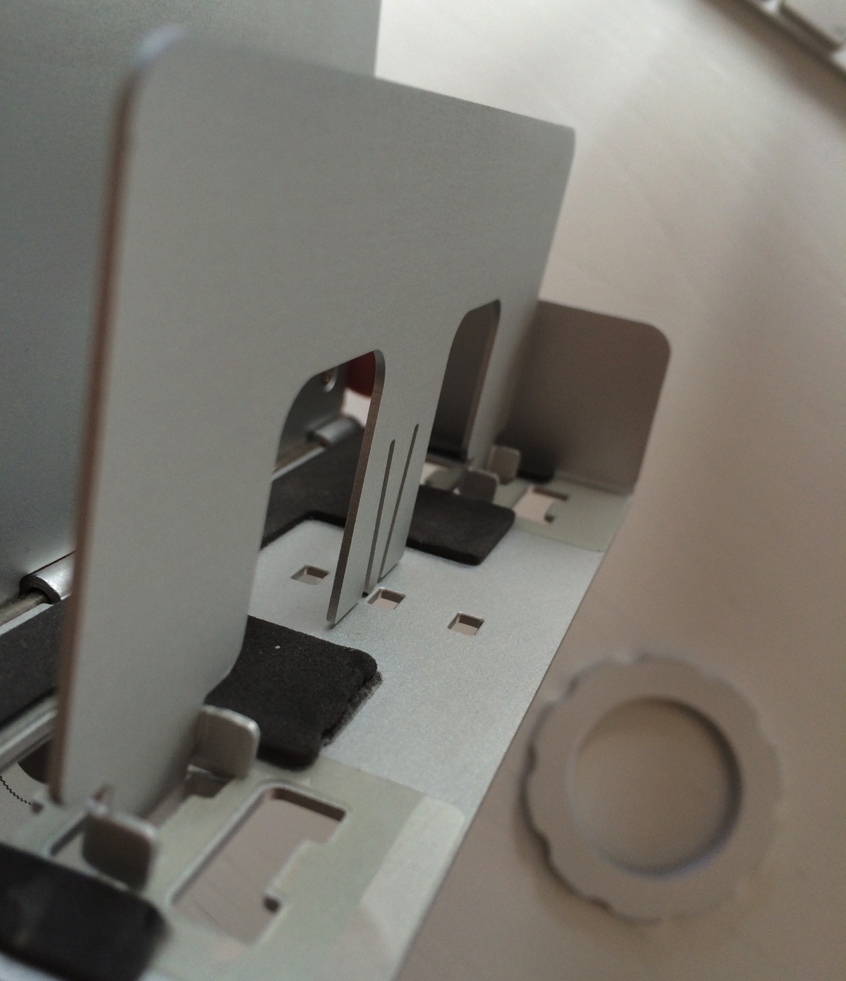 La maggior parte delle parti è in in alluminio satinato e ben si sposa con le finiture del supporto di iMac mentre la termoplastica del sistema di avvitamento ha colori sufficientemente in linea con il resto del supporto metallico. Il sistema è “ribaltabile” grazie ad una cerniera ed è conformato ad “L” per fornire una battuta al dispositivo che ospita e non farlo sfilare dalla mensola.