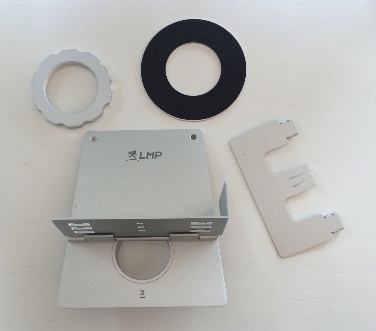 LMP iBracket nasce per rispondere a queste esigenze utilizzando una caratteristica comune a tutti gli iMac più recenti e pure ai monitor di grande formato Apple introdotti negli ultimi anni: il foro scavato nella parte superiore della barra di supporto che viene utilizzato normalmente per instradare il cavo di alimentazione e altri cavi dal retro del display alle prese esterne.
