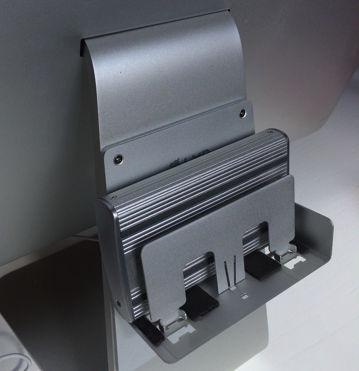 La staffa si è dimostrata ben solida e molto comoda per l’uso previsto e potrebbe essere anche l’occasione per montare un secondo fisco SSD o tradizionale da gestire con la modalità Fusion Drive. Visto che si sfrutta il posizionamento in verticale delle periferiche la sponda laterale è un ottimo sistema per evitare disastrosi ribaltamenti magari in fase di pulizia del retro dello schermo o per qualche cavo spostato per sbaglio.