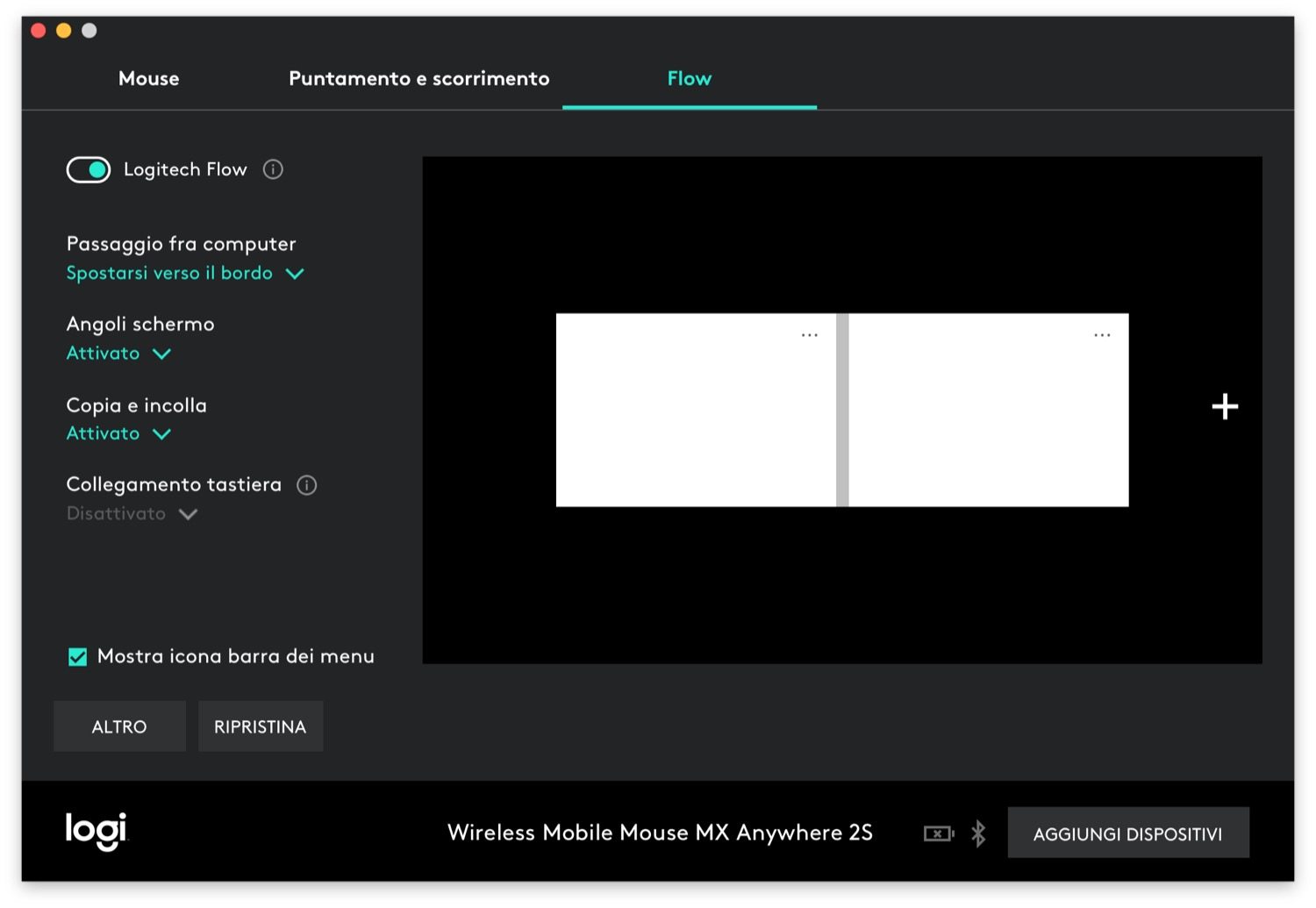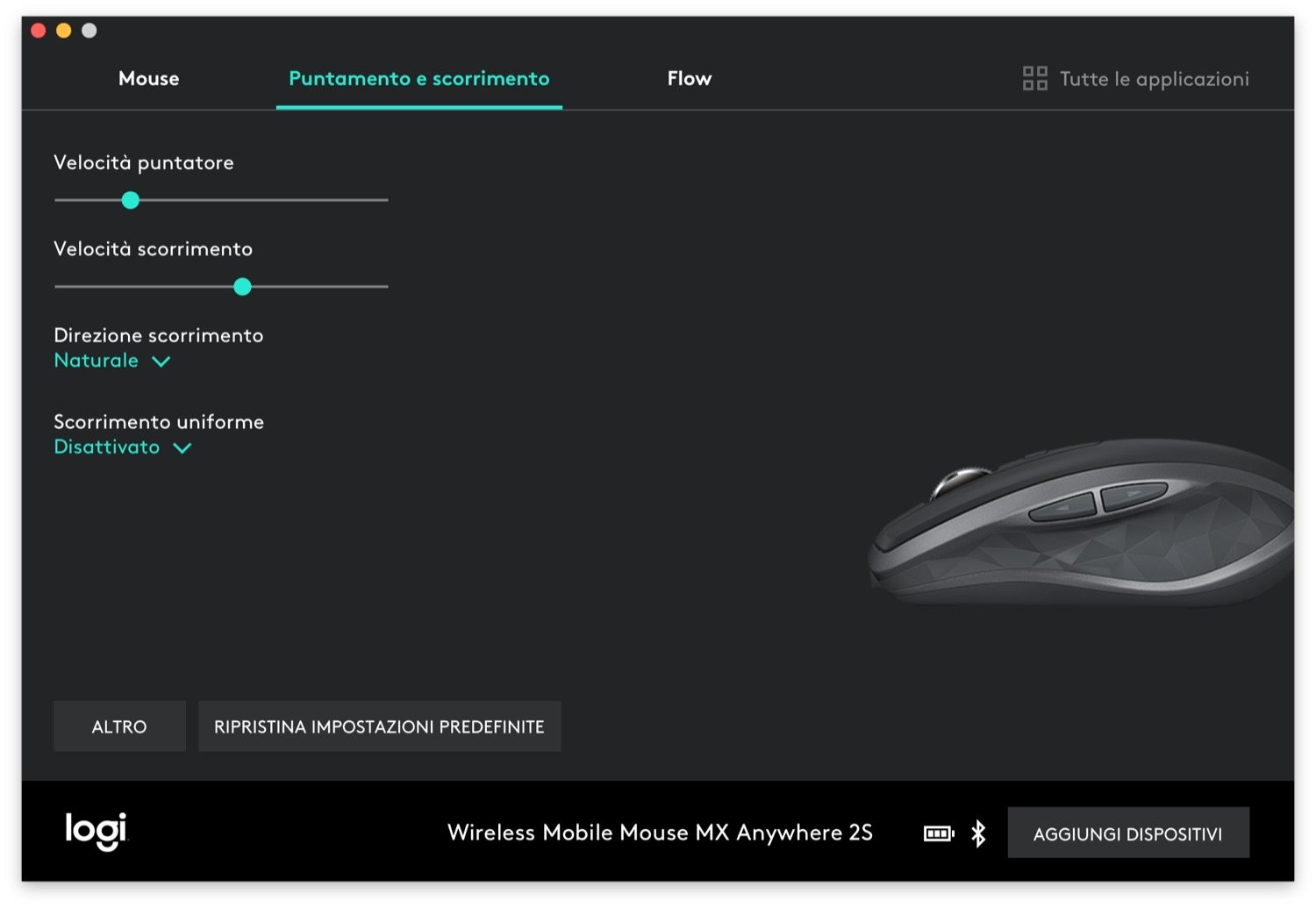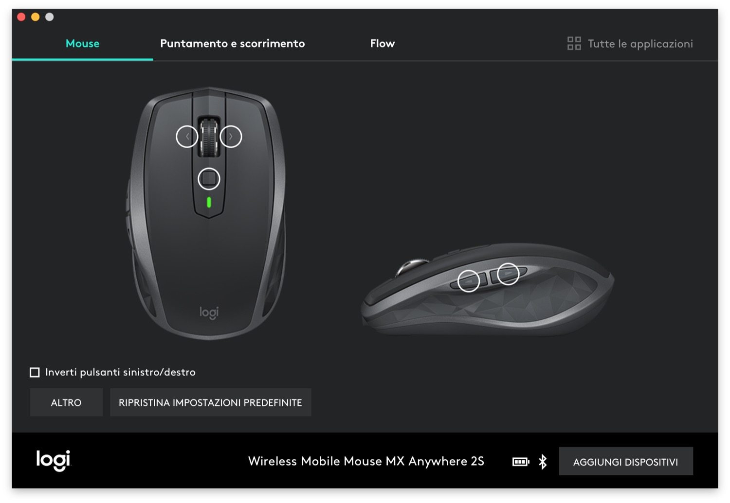 Nella parte inferiore è disponibile un pulsante per la scelta di tre dispositivi, che possono essere collegati in modo alternativo con un semplice clic: questa funzione, comoda, è a tratti resa inutile da Flow, la nuova tecnologia che permette al mouse di fare un passo in più rispetto alla concorrenza.