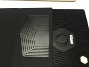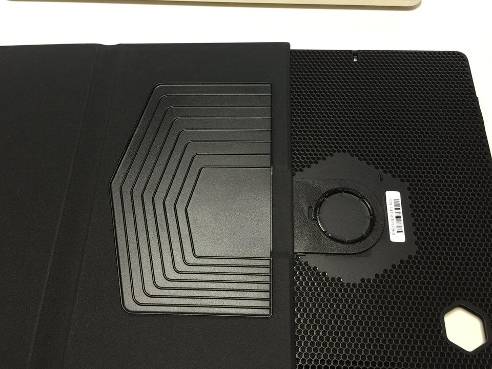 Internamente troviamo un guscio protettivo in una plastica stampata a nido d’ape ed un generoso rinforzo che contribuisce ad aggiungere rigidità al dorso della cover.