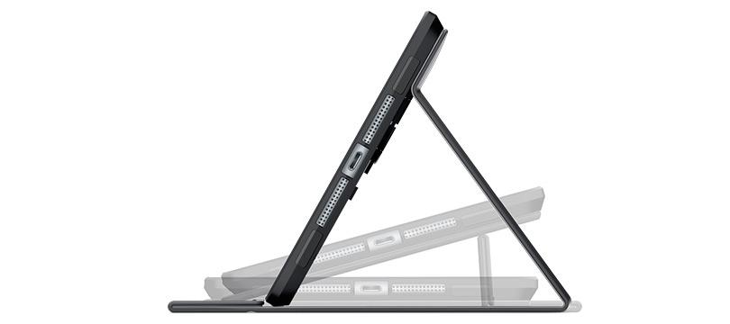 Il meccanismo di rotazione è pensato per essere molto solido e funzionale. Un dente a scatto regola il vari livelli della rotazione con un blocco progressivo e preciso che non abbiamo visto in altri prodotti simili. Il guscio si incastra con molta precisione ma lascia libere tutte le porte, microfoni compresi anche se l’intera parte metallica dell’iPad viene coperta.