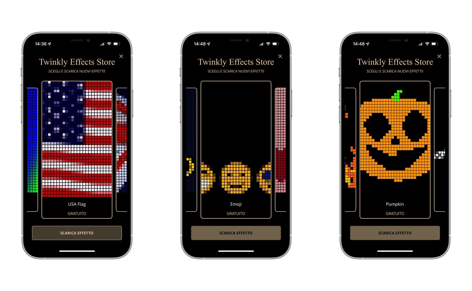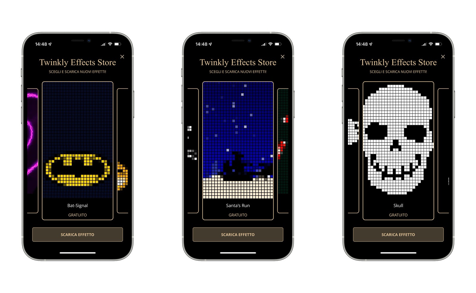 Sono scaricabili da Twinkly anche diversi effetti aggiuntivi, alcuni dei quali davvero simpatici come il segnale di Batman, foglie autunnali, una serie di emoticon, una renna di corsa e così via. Non tutti però sono facili da utilizzare né presentano qualità sufficiente per piccole installazioni. Altri sono adatte solo per superfici lineari.