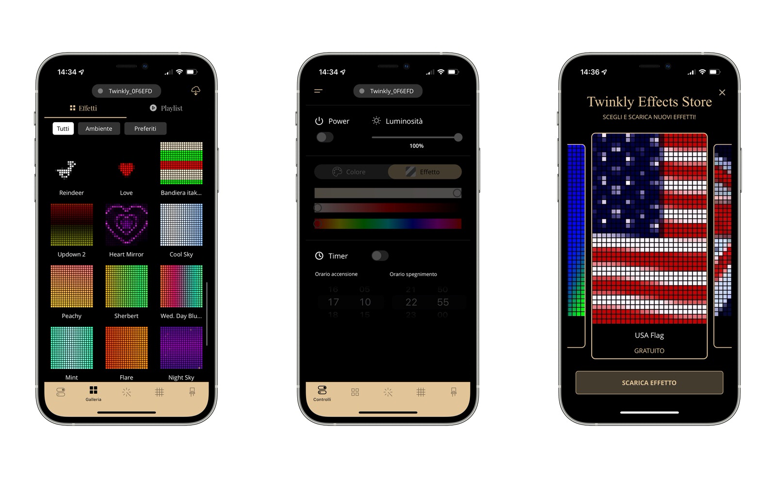 Il grande punto di forza delle Twinkly è la straordinaria esperienza di personalizzazione che offrono attraverso l’applicazione. Con essa si può fare un enorme numero di cose. Solo per elencarne qualcuna: fare un selezione tra decine di effetti e poi personalizzarli, scaricarne altri dal cloud di Twinkly, costruirne di nuovi da zero disegnando a mano libera, creare delle playlist di effetti.