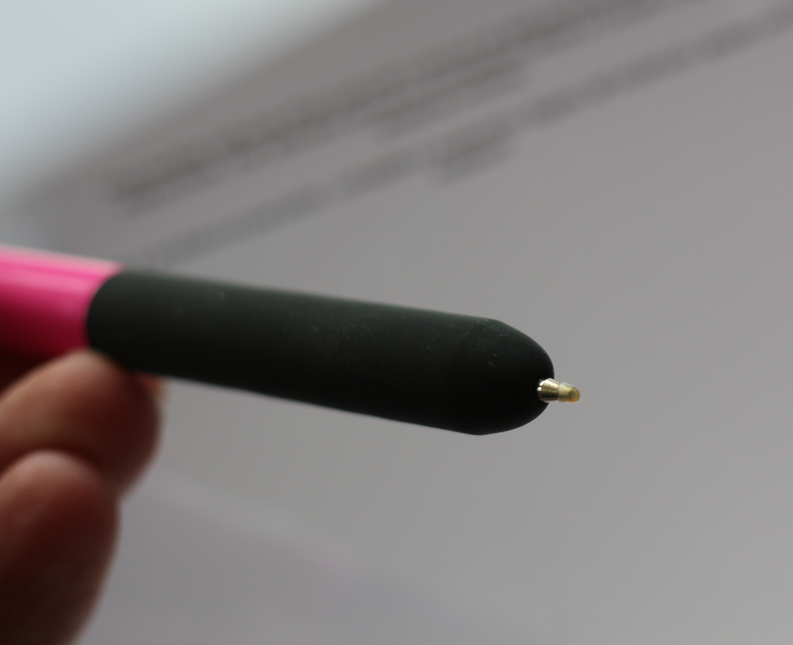Come potete vedere dalle immagini infatti, la metà inferiore di LUNATIK Touch Pen è caratterizzata da materiale in gomma capacitivo, che permette alla punta di scrivere sui display touchscreen: la punta non è completamente chiusa come i soliti pennini in quanto deve appunto permettere alla penna di poter essere estratta in caso di necessità. Ciò non comporta alcun problema durante l’utilizzo in quanto, essendo morbida, alla minima pressione si adatta perfettamente al display garantendo una continuità al tratto.