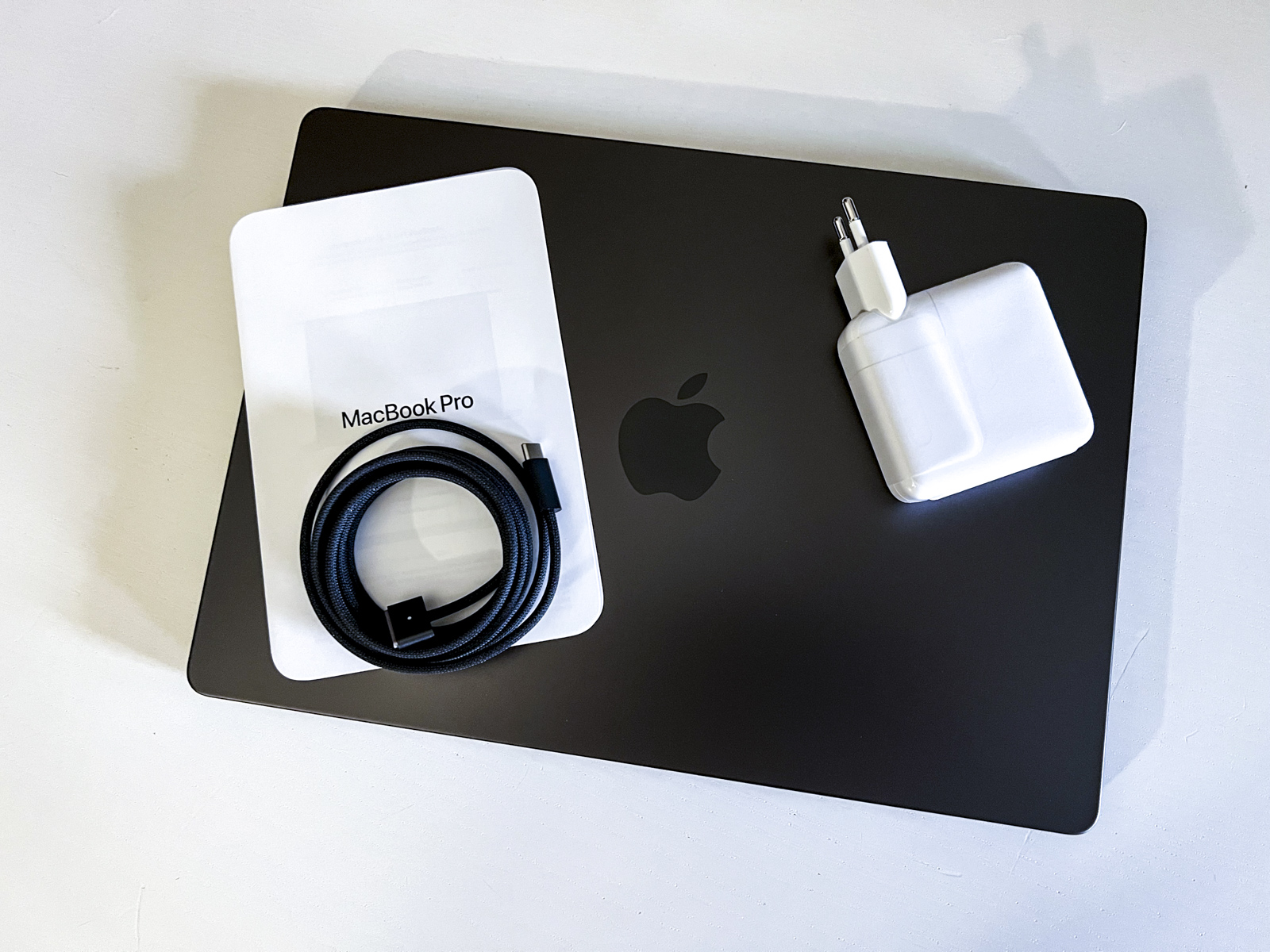 Al suo interno troviamo MacBook Pro 14 con M3 Pro vero e proprio, nel nuovo colore Nero Siderale, sul quale torniamo tra poco, il caricabatterie e il cavo di alimentazione con connettore MagSafe da una parte e USB-C dall’altra, più qualche piccola scartoffia di Apple.
