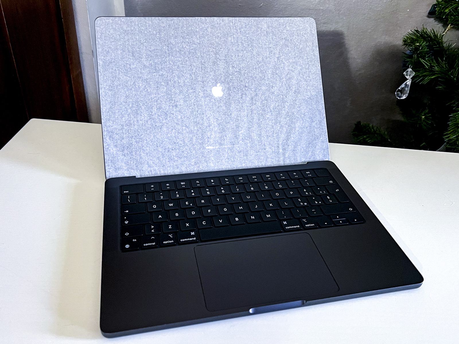 Una volta aperto MacBook Pro 14 M3 Pro, la prima cosa che si nota è la tastiera retroilluminata: ovviamente non è una novità, ma con un colore così scuro emerge molto di più e in alcuni casi è davvero necessaria dato che anche la tastiera è di colore scuro.