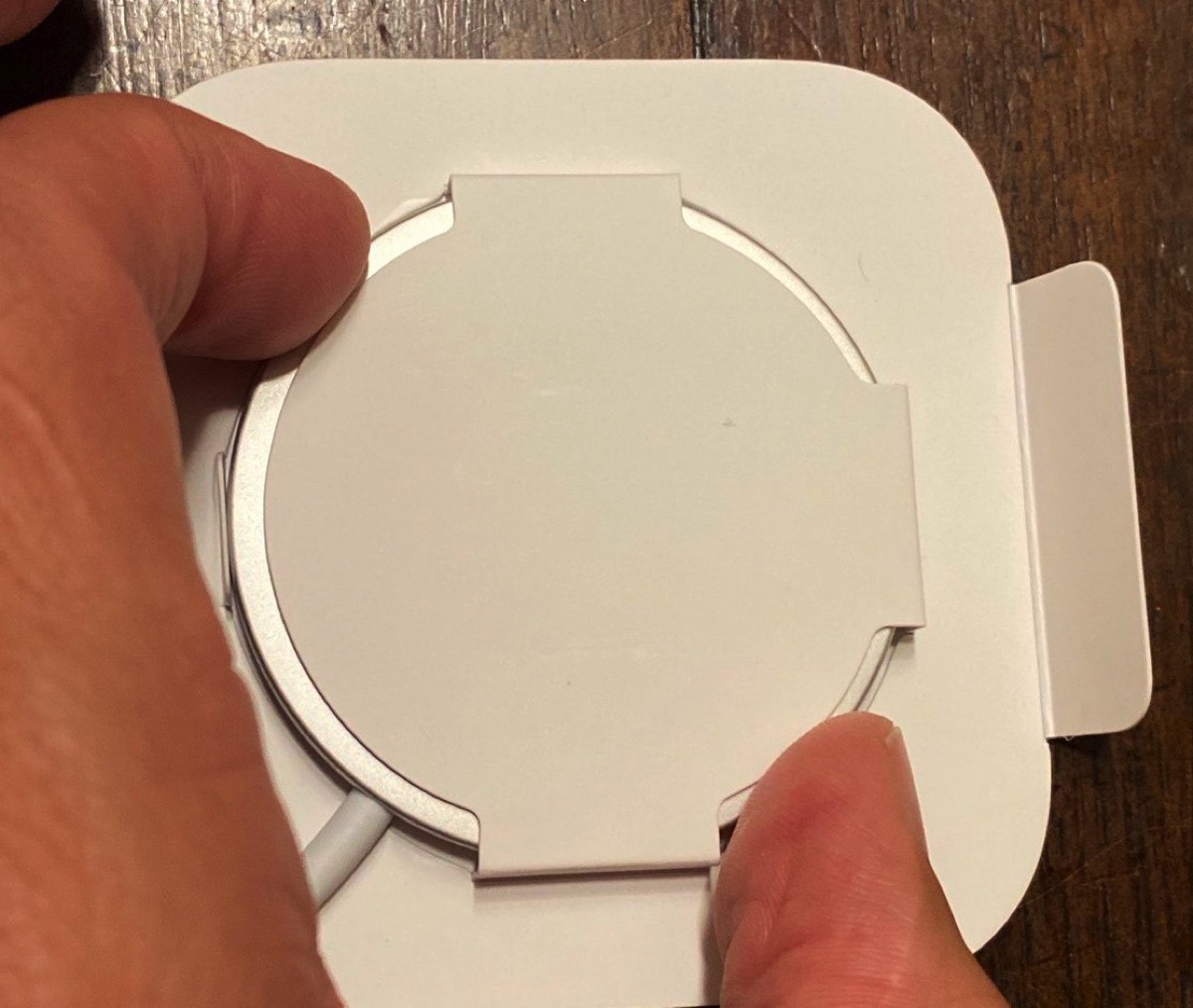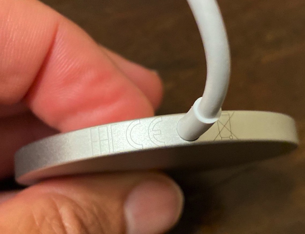 Detto di cosa fa, vediamo ora come l’alimentatore Magsafe è fatto anche se chi conosce un caricabatterie per Apple Watch dovrebbe avere una idea piuttosto precisa. Possiamo infatti descriverlo dal punto di vista del design come una versione maggiorata di quell’accessorio, un disco in plastica bianca bordato da una cornice in alluminio. Il cavo lungo circa 90 centimetri ha un connettore USB-C. L’aspetto è minimalista e in un tempo fornisce l’impressione di un prodotto di ottima qualità. Grazie ad iFixit che ha smontato questo caricabatterie sappiamo anche come è fatto all’interno; c’è una grande spirale circondata da magneti che agganciano alla corona che si trova dentro all’iPhone.