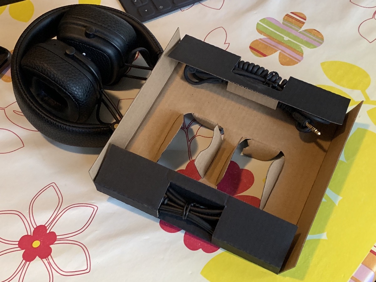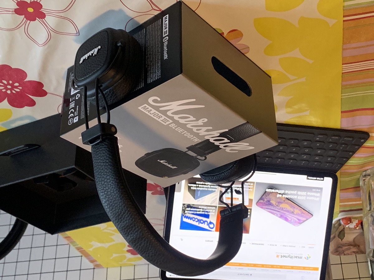 Le cuffie, disponibili in tre colori (bianco, nero e marrone), sono state provate nella versione classica nera, con la scritta iconica Marshall su entrambi i padiglioni. Nella confezione sono presenti un cavo micro Usb per la ricarica e un cavo audio con incorporato il microfono e controllo play/rispondi. Il cavo ha un terminale minijack angolato e un dritto. Quello che va inserito nella cuffia è quello con il jack con due separatori degli elementi, mentre quello con tre va messo nel telefono. Ovviamente per le attuali generazioni di iPhone e iPad Pro è necessario un adattatore Apple minijack-Lightning.