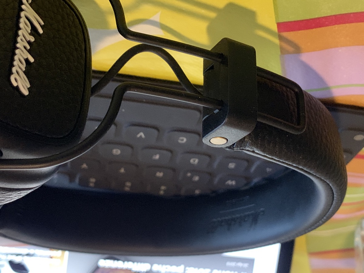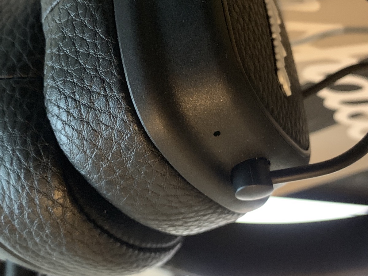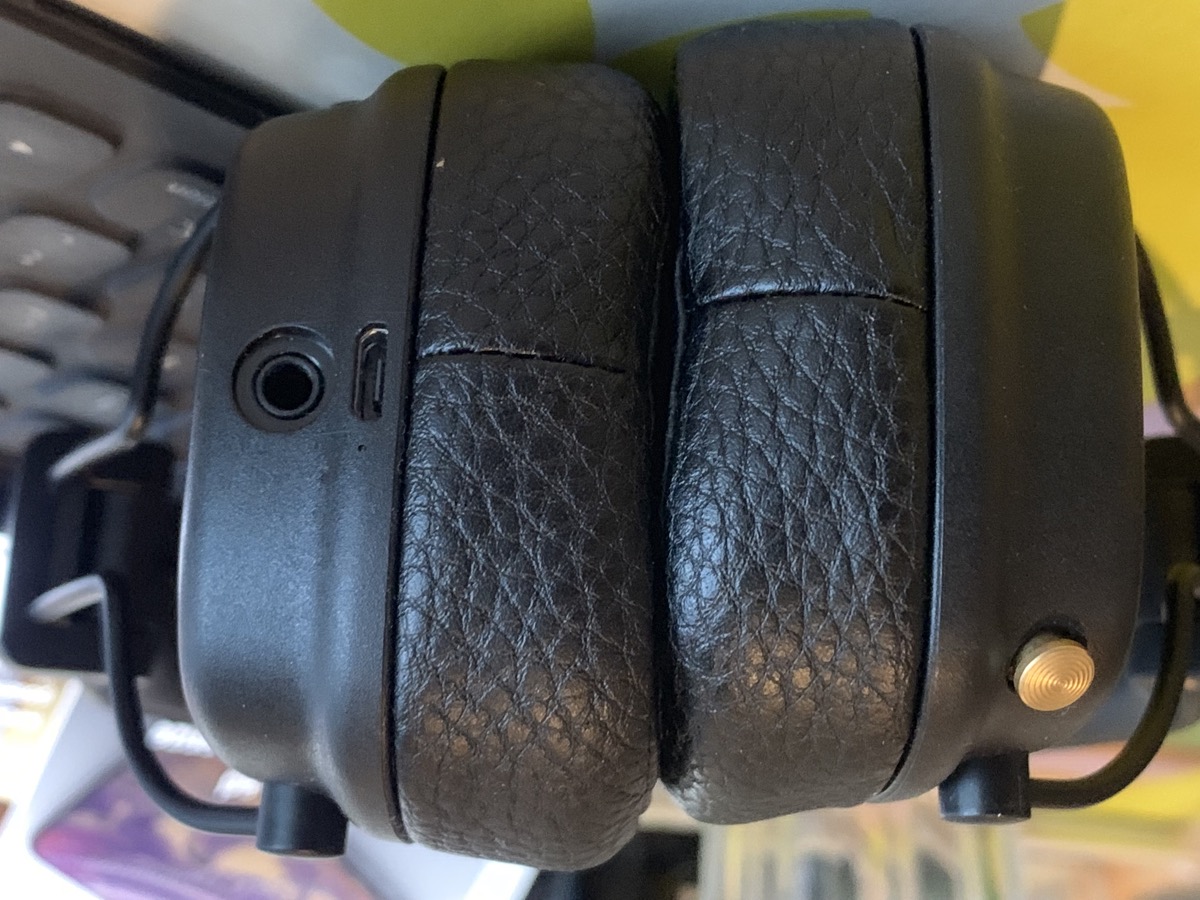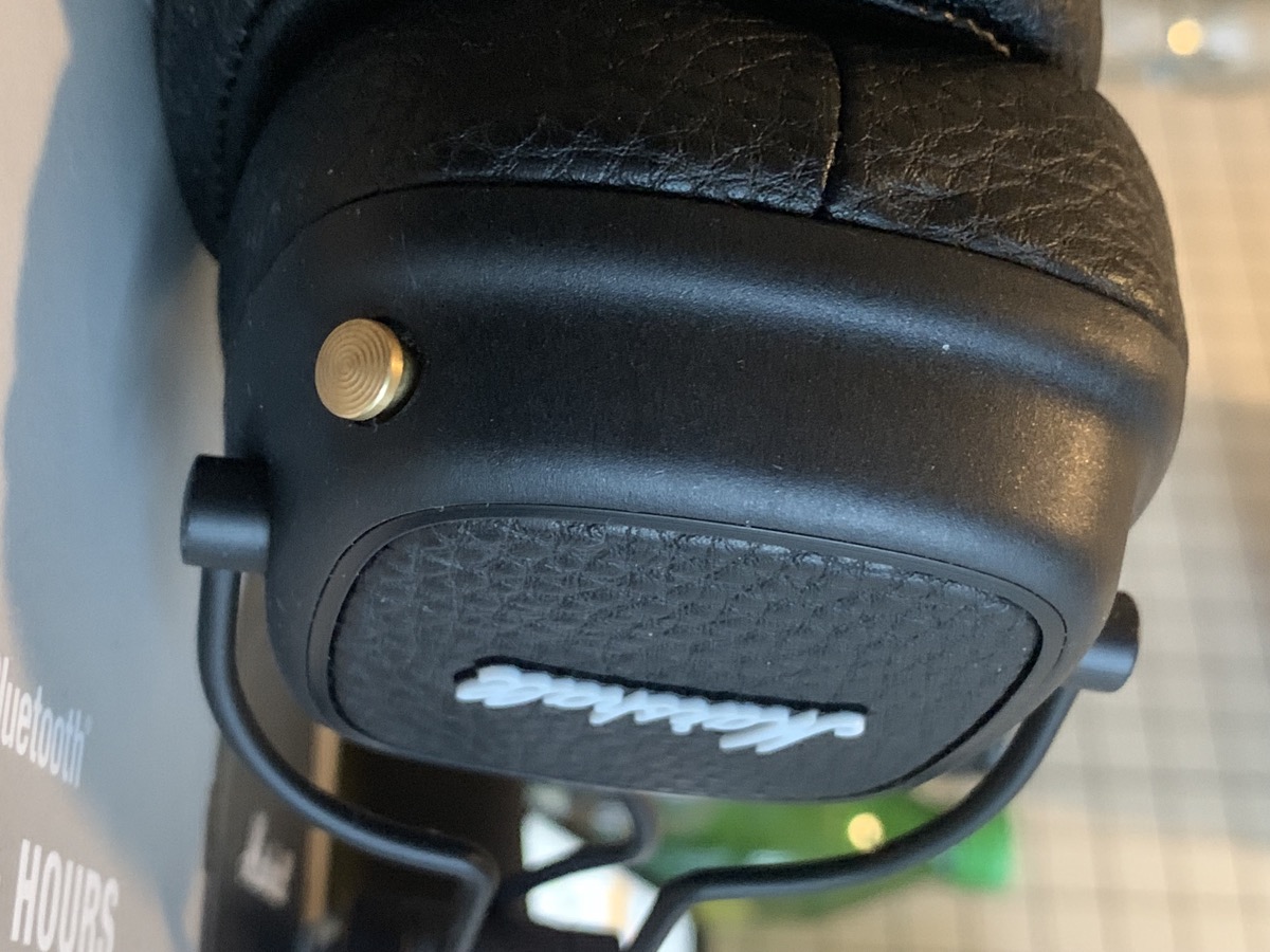 Sul lato della cuffia sinistra è presente anche il minijoystick di Marshall, realizzato in ottone, estremamente solido e compatto, che serve ad accendere e spegnere le cuffie, metterle in modalità “ricerca” per effettuare il pairing con un dispositivo Bluetooth e per regolare volume e track precedente/successiva.
