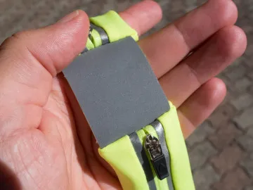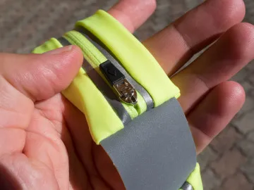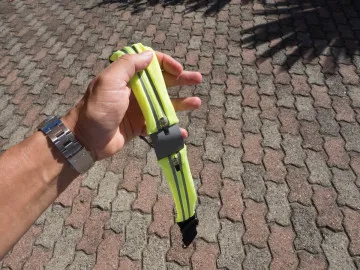 I materiali sono la prima cosa che colpisce. Il tessuto sintetico, in Spandex-Lycra dice Inateck, è spesso, robusto ed impermeabile. Internamente è infatti rivestito di una pellicola plastica che impedisce all’acqua e anche al sudore di penetrare all’interno. Questo rendere la fascia in grado di proteggere un dispositivo che andremo a collocare al suo interno. Danno l’impressione di essere molto buoni e curati anche gli altri elementi: la fascia elastica, di larghezza molto generosa (4 centimetri), il che impedisce che si arrotoli, e le fibbie e i ganci. Per dimensioni e tenuta, queste ultime ci hanno ricordato molto quelle che vengono usate nelle cinghie per le valigie. Anche le cerniere sembrano di ottima qualità. Da segnalare le finiture in materiale catarifrangente: si tratta di due strisce che percorrono tutta la parte con le tasche e di un tassello largo 4 centimetri e lungo circa cinque, che unisce le due tasche. Il marsupio, da chiuso, va da 79 a 97 cm. Dovrebbe quindi essere adatto ad un vasto pubblico, anche grazie ai due elementi elastici.