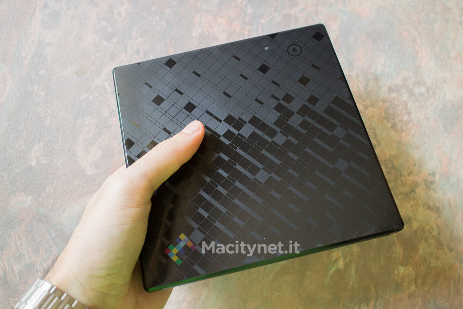 Misura 15 x 14,7 x 1,5 centimetri e pesa all’incirca 285 grammi, quindi non appesantisce troppo la borsa del computer quando lo si infila in una delle sue tasche per portarlo negli spostamenti tra casa e ufficio. Tutto il corpo è in plastica, ruvida nella metà inferiore e lucida e liscia in quella superiore, sulla quale è stampata una trama reticolare.