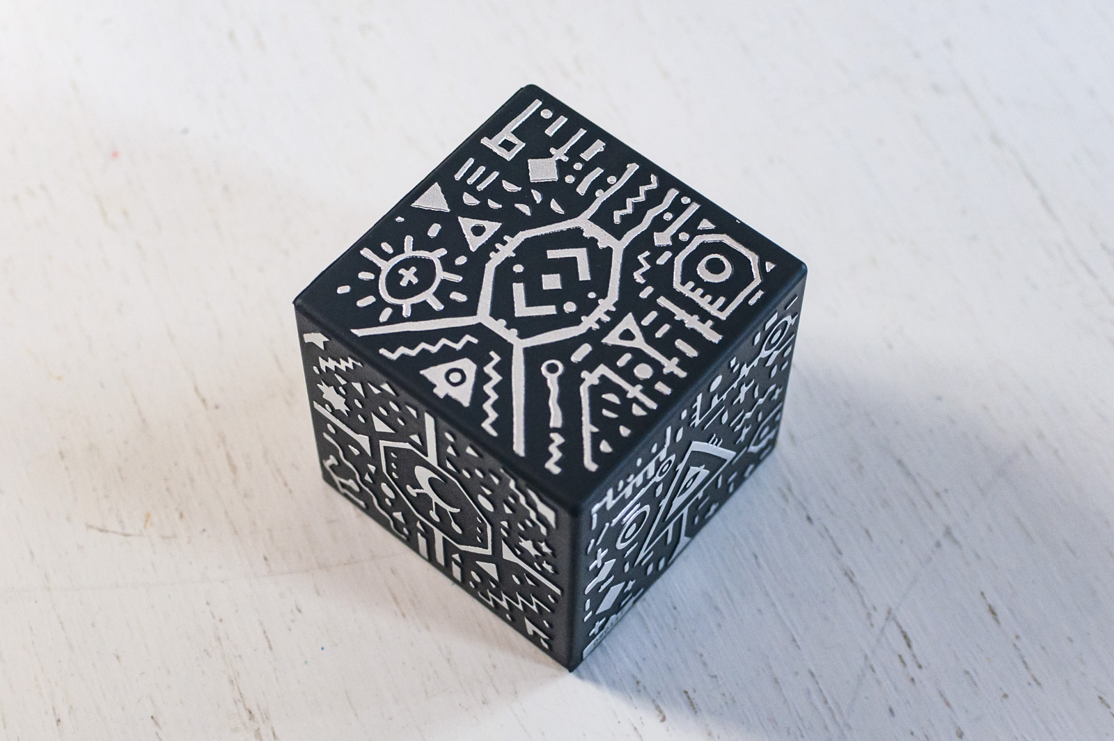 La confezione si lascia aprire facilmente rivelando il Cubo, un artefatto a sei facce realizzato in gomma semi rigida dal peso di 73 grammi, con decorazioni dipinte e leggermente in rilievo. Ad un occhio disattento le decorazioni dei 6 lati, tutte diverse, sembrano casuali o perlomeno rieccheggiano quelle di qualche film o fumetto.