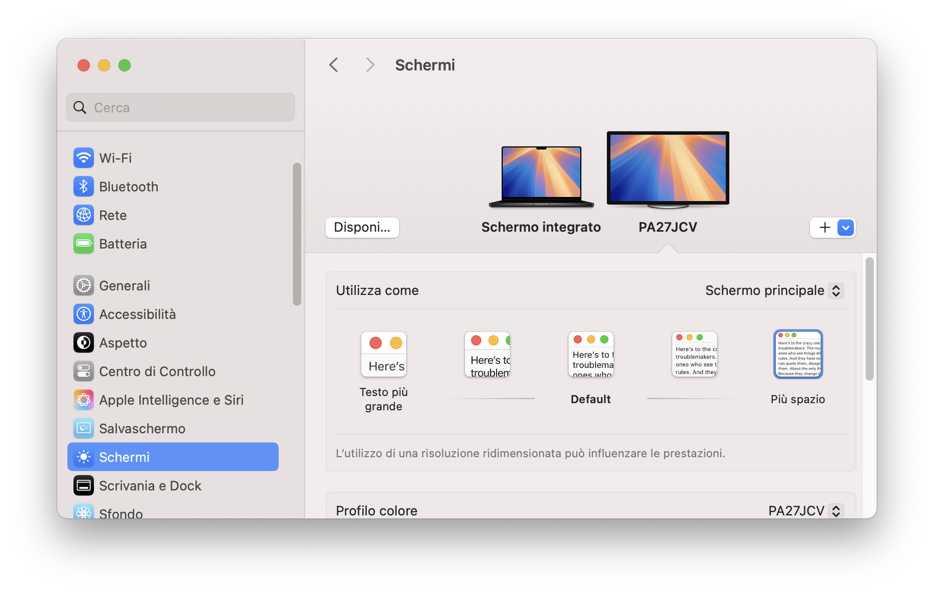 Il valore di 218 PPI di questo monitor aiuta molto, perché il Mac mostra già un valore simile a quello di default di macOS, e non è un caso che tutti i display dei Mac e di Apple siano 5K (e non 4K, una differenza che è sia commerciale che tecnica) o con risoluzioni a volte anomale per il mercato.