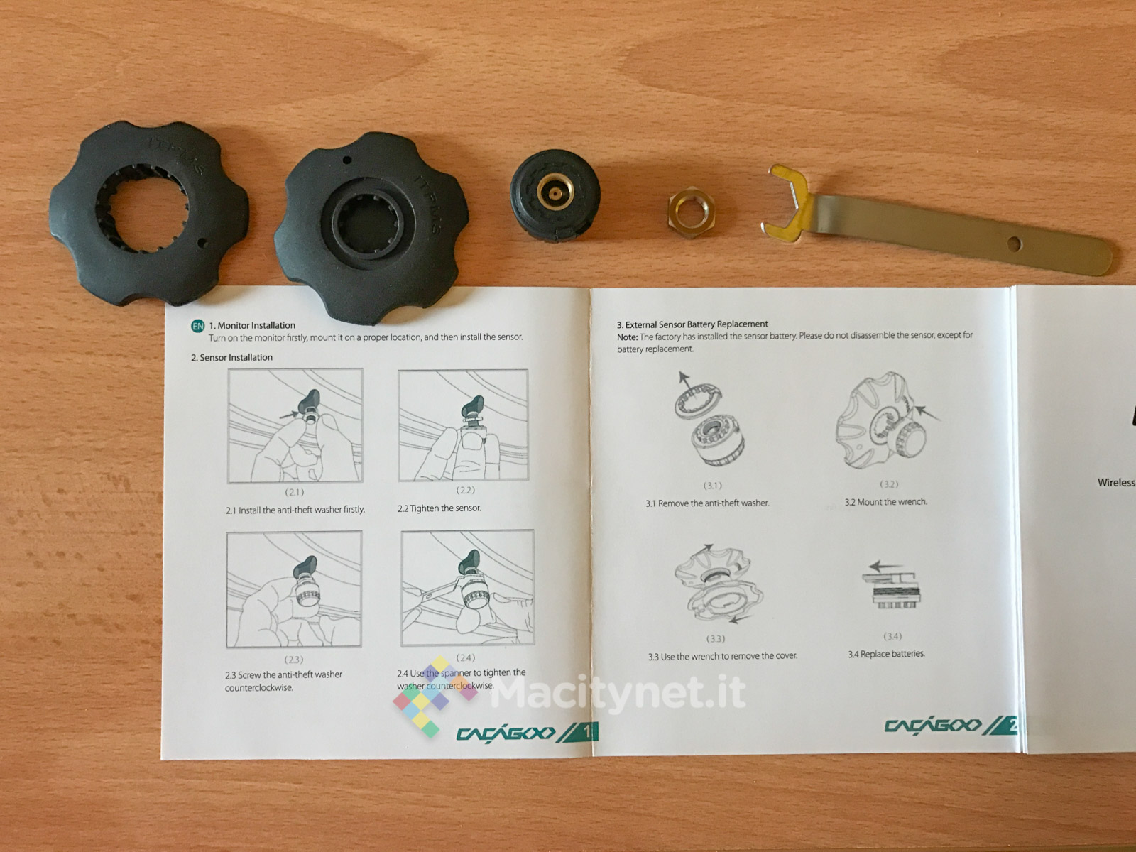 Fin dallo spacchettamento, il nostro primo dubbio è stato: e se mi rubano i sensori? A questa domanda rispondono, seppur non direttamente, le istruzioni d’uso. Nel montaggio dei sensori infatti il sistema combina una rondella per ciascun sensore che andrà a bloccare quest’ultimo alla valvola. Non è la soluzione del secolo ma certamente tiene alla larga i furti più semplici, in quanto non solo bisognerà trovarsi al posto giusto e al momento giusto, ma si dovrà avere in tasca anche la chiave inglese delle giuste dimensioni e di una forma tale da garantire il corretto serraggio della rondella.