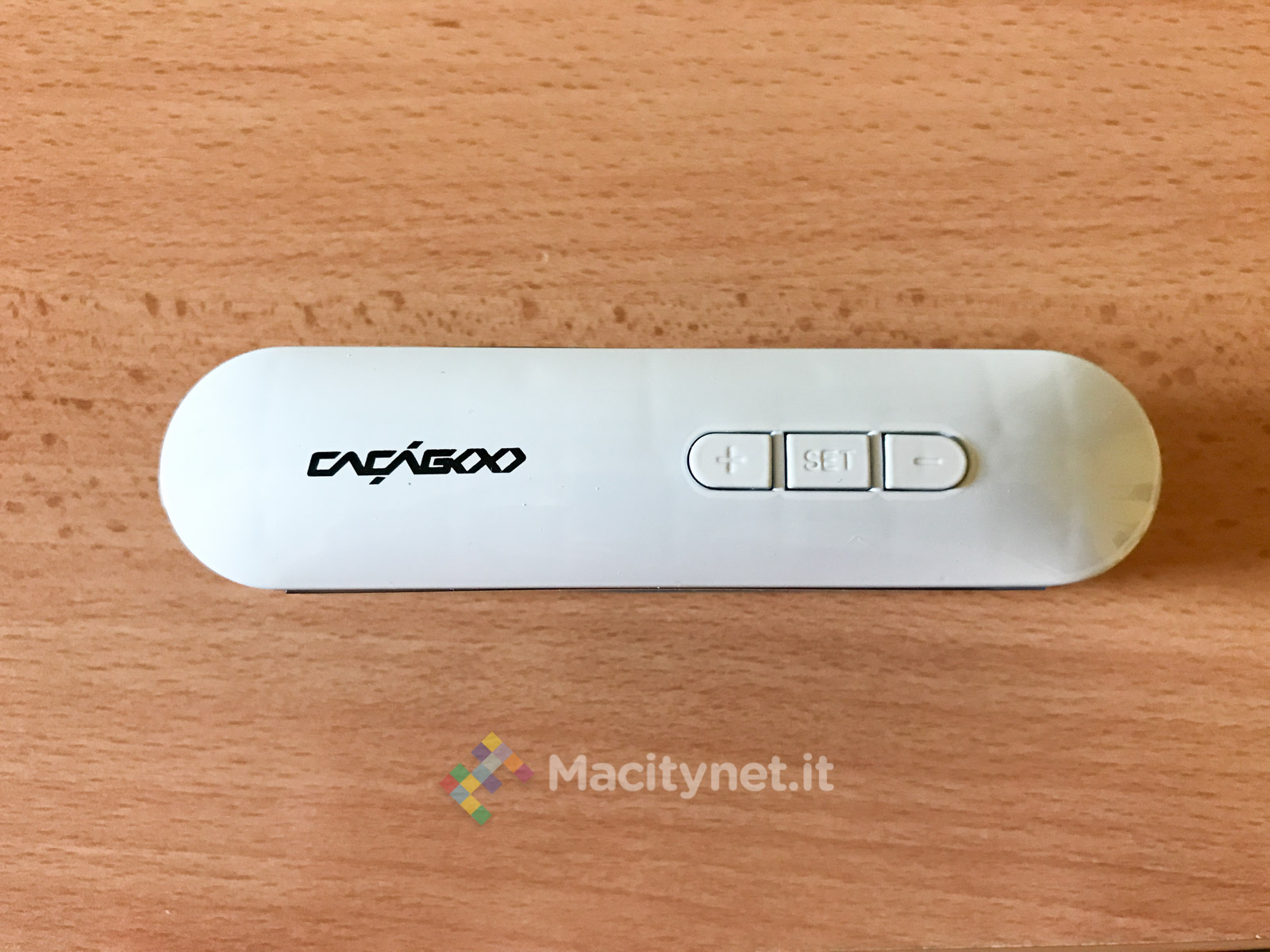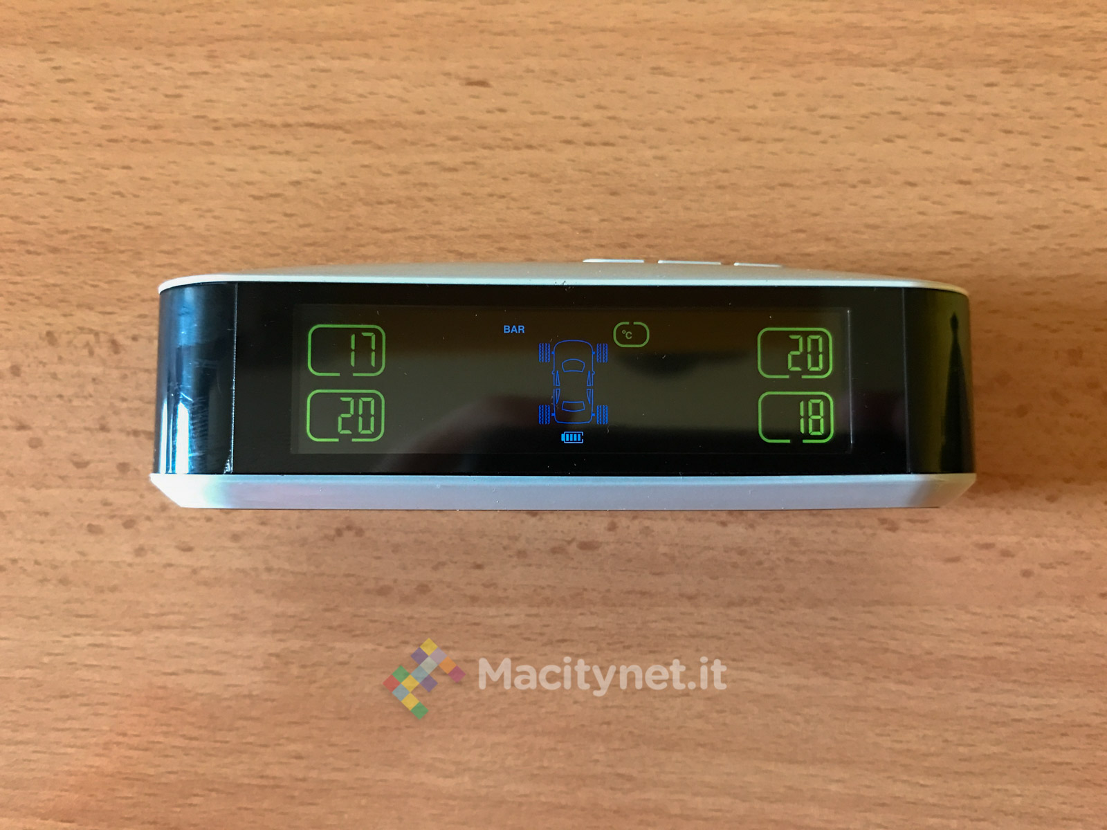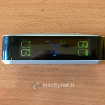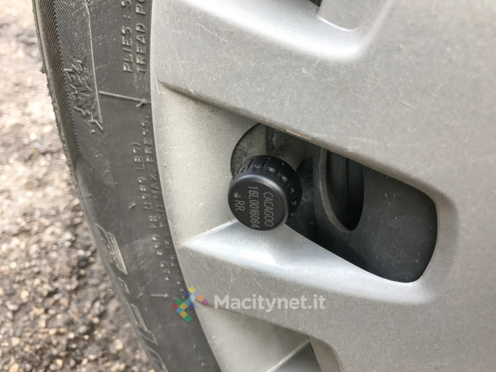 Il sistema in prova è il Cacagoo CA01. In vendita su Amazon, si compone sostanzialmente di un monitor piuttosto compatto (misura circa 10 x 3 x 3 centimetri, quanto basta per lasciarlo vagare tranquillamente nel portaoggetti dell’auto, eventualmente lo si può attaccare saldamente in un qualsiasi punto del cruscotto sfruttando il tappetino in gel incluso nella confezione) e quattro sensori che sostituiscono i classici tappi che proteggono la valvola dei pneumatici e monitorano costantemente e in tempo reale pressione e temperatura del singolo pneumatico.