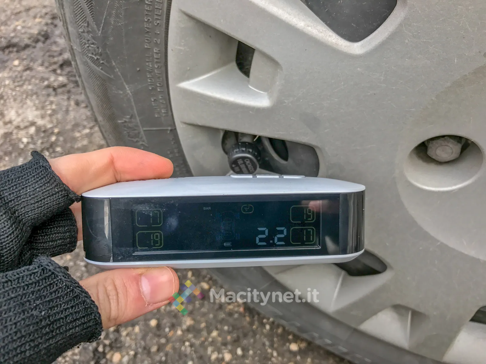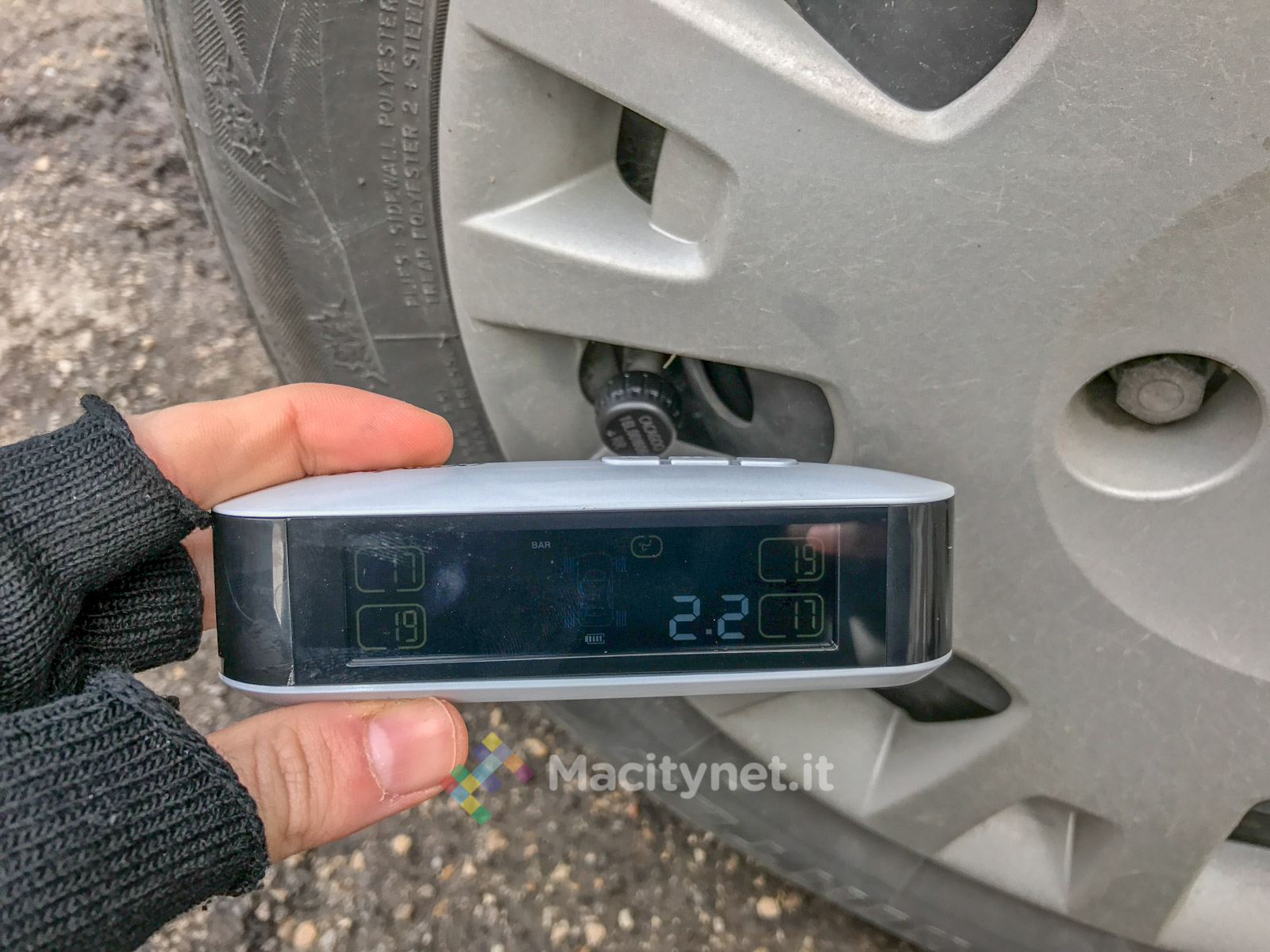 Il primo test che abbiamo messo in atto è stato quello di verificare il corretto funzionamento del sistema. Manometro alla mano, abbiamo quindi misurato manualmente la pressione dei pneumatici, confrontando poi i valori riportati dai sensori. L’errore è di circa ±0.1 BAR, del tutto accettabile per l’uso per cui è concepito questo accessorio.