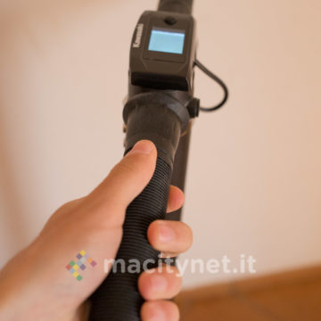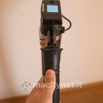 Il manubrio è molto spesso (diametro 5,5 centimetri al cui interno è installata anche la batteria) e alla sua estremità c’è il manico, molto ampio (40 centimetri da una parte all’altra, 103 centimetri da terra) ma che può essere ripiegato per ridurne gli ingombri durante il trasporto. E’ sufficiente tirare ciascuna delle due parti verso l’esterno per tendere la molla, quindi fletterle verso il basso: viceversa, quando si prepara il monopattino per la corsa, basta tirarle verso l’alto e con uno scatto si bloccheranno automaticamente nella giusta posizione.