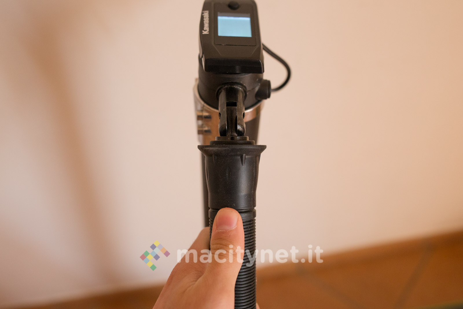 Il manubrio è molto spesso (diametro 5,5 centimetri al cui interno è installata anche la batteria) e alla sua estremità c’è il manico, molto ampio (40 centimetri da una parte all’altra, 103 centimetri da terra) ma che può essere ripiegato per ridurne gli ingombri durante il trasporto. E’ sufficiente tirare ciascuna delle due parti verso l’esterno per tendere la molla, quindi fletterle verso il basso: viceversa, quando si prepara il monopattino per la corsa, basta tirarle verso l’alto e con uno scatto si bloccheranno automaticamente nella giusta posizione.