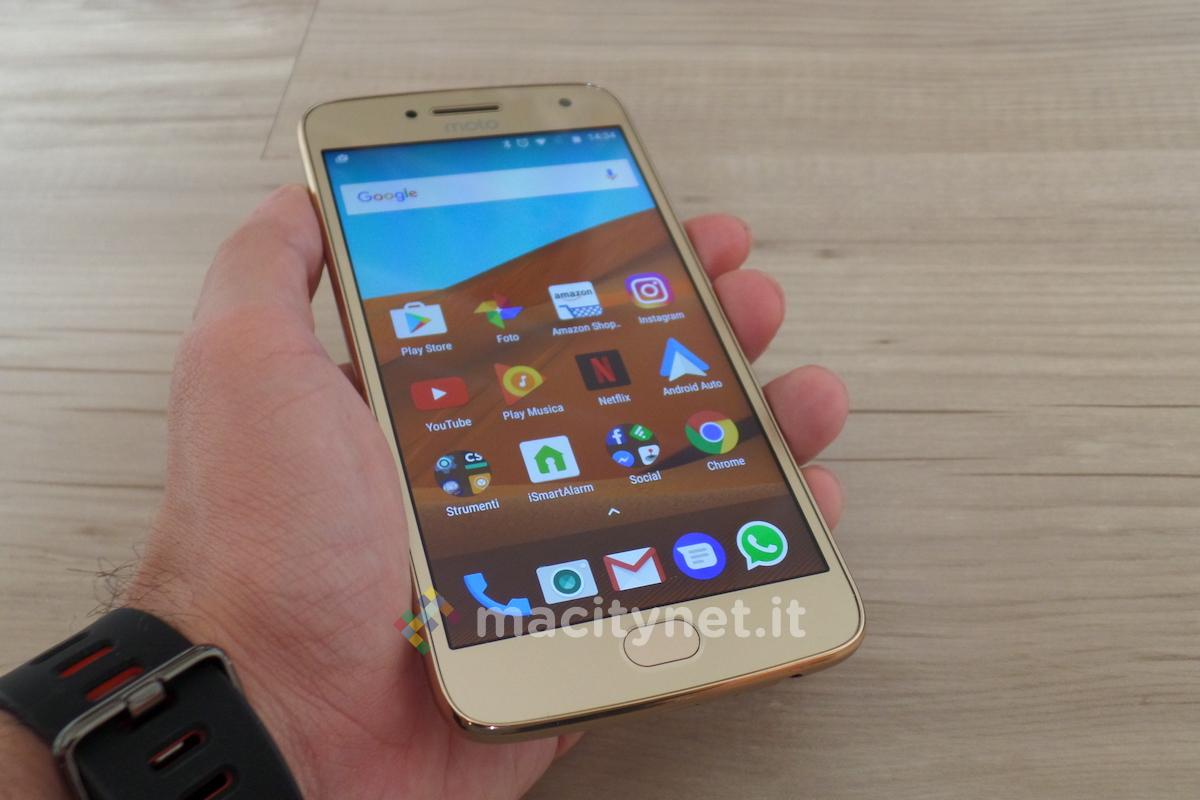 Caratteristiche tecniche alla mano, Moto G5 si situa nella fascia media, senza sfigurare nel confronfronto co eventuali top di gamma. Ha dimensioni di 150.2 x 74 x 7.7 mm , con un peso di 155g. In mano si tiene particolarmente bene, non scivola e si avverte una sensazione di robustezza e solidità. Il display è un IPS da 5,2 pollici, con risoluzione Full HD e una densità di pixel pari a 424. Molto buoni i colori, ma ciò che più ci ha stupiti è la sua leggibilità anche sotto la luce solare diretta.